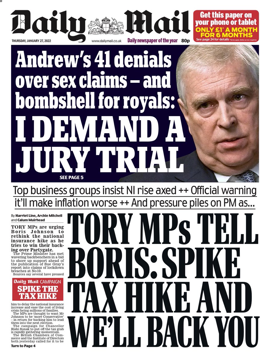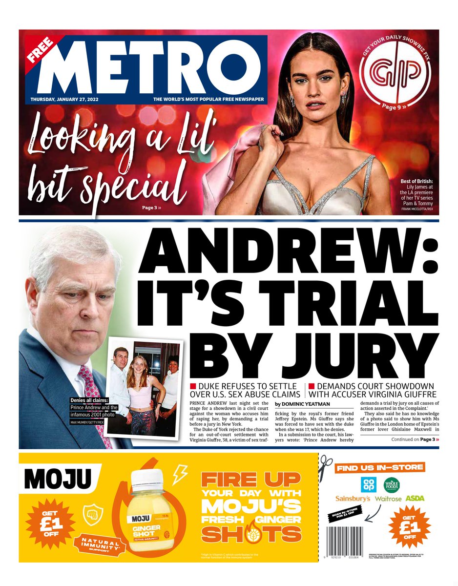 his trial over sex assault allegations brought by accuser Virginia Giuffre, according to the Daily Mirror. The prince denies all the claims against him.