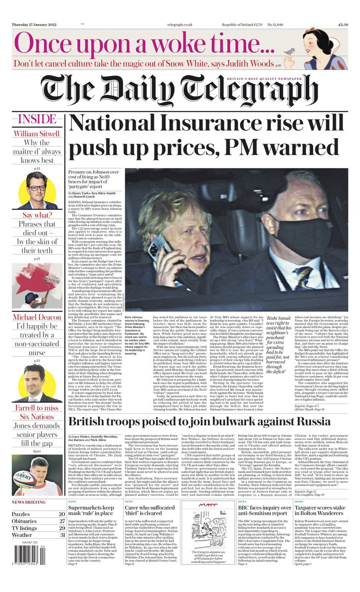 The Daily Telegraph leads with a report by MPs which has warned the prime minister that raising National Insurance contributions will lead to higher prices in shops.