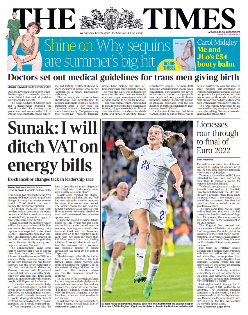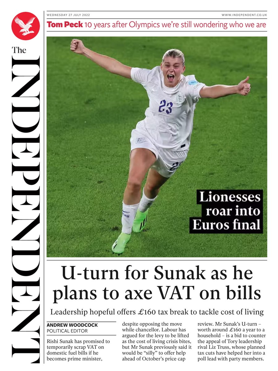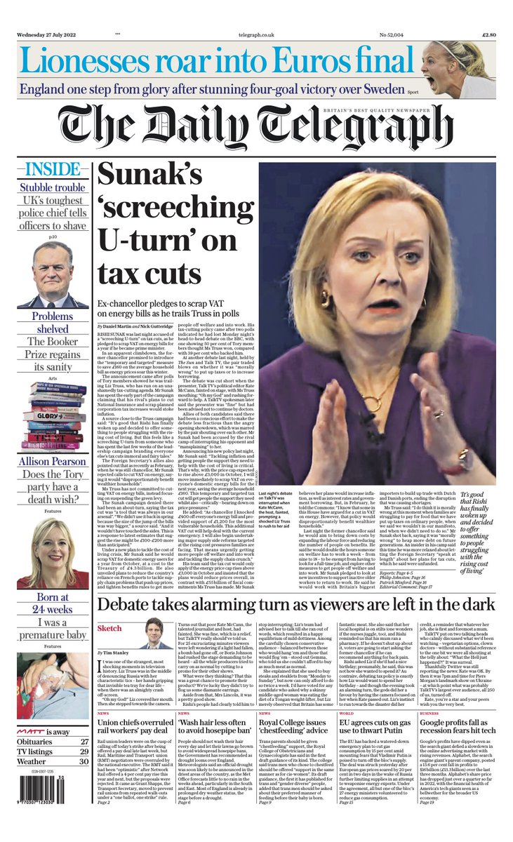 According to The Daily Telegraph, Rishi Sunak has been accused of a “screeching U-turn” after promising to scrap VAT on energy bills in a year if he becomes PM.