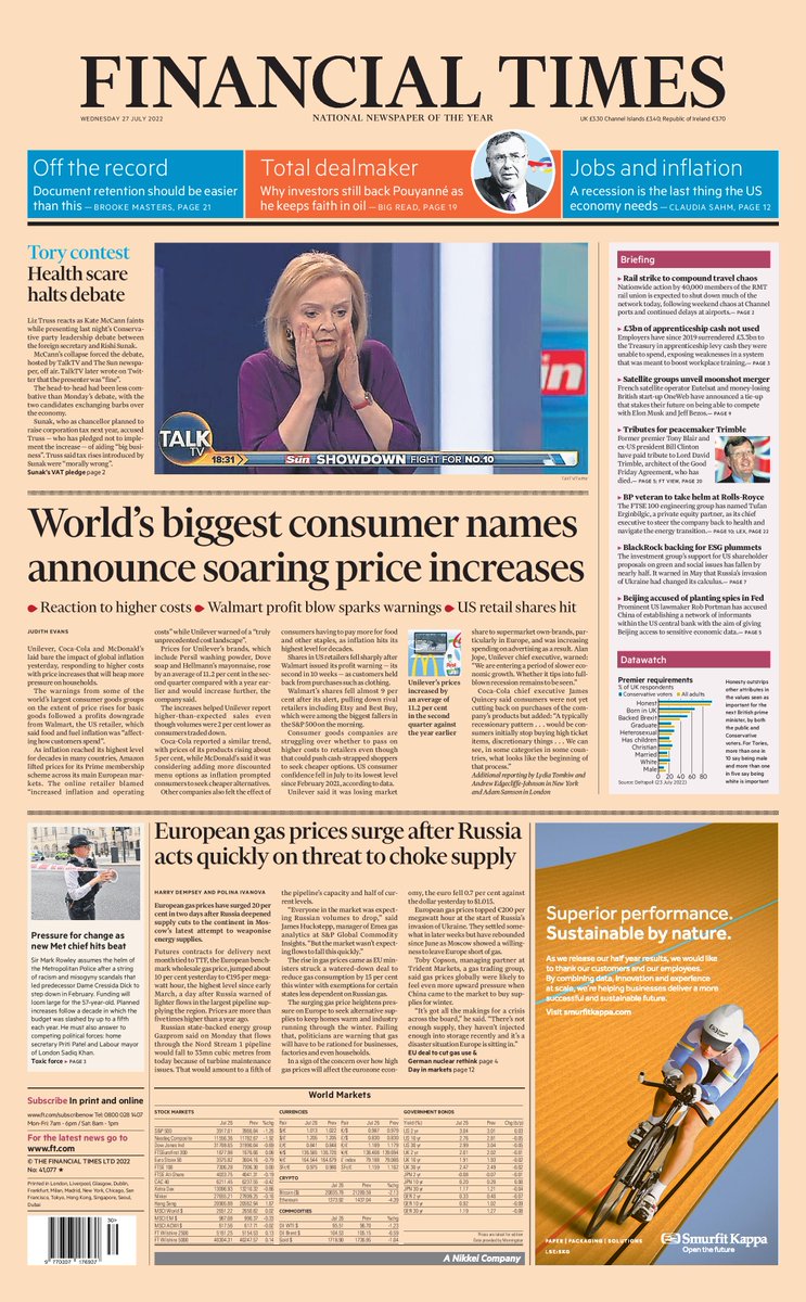 Consumers are being passed on rising costs by Coca-Cola, Unilever, and McDonald’s, according to the Financial Times.