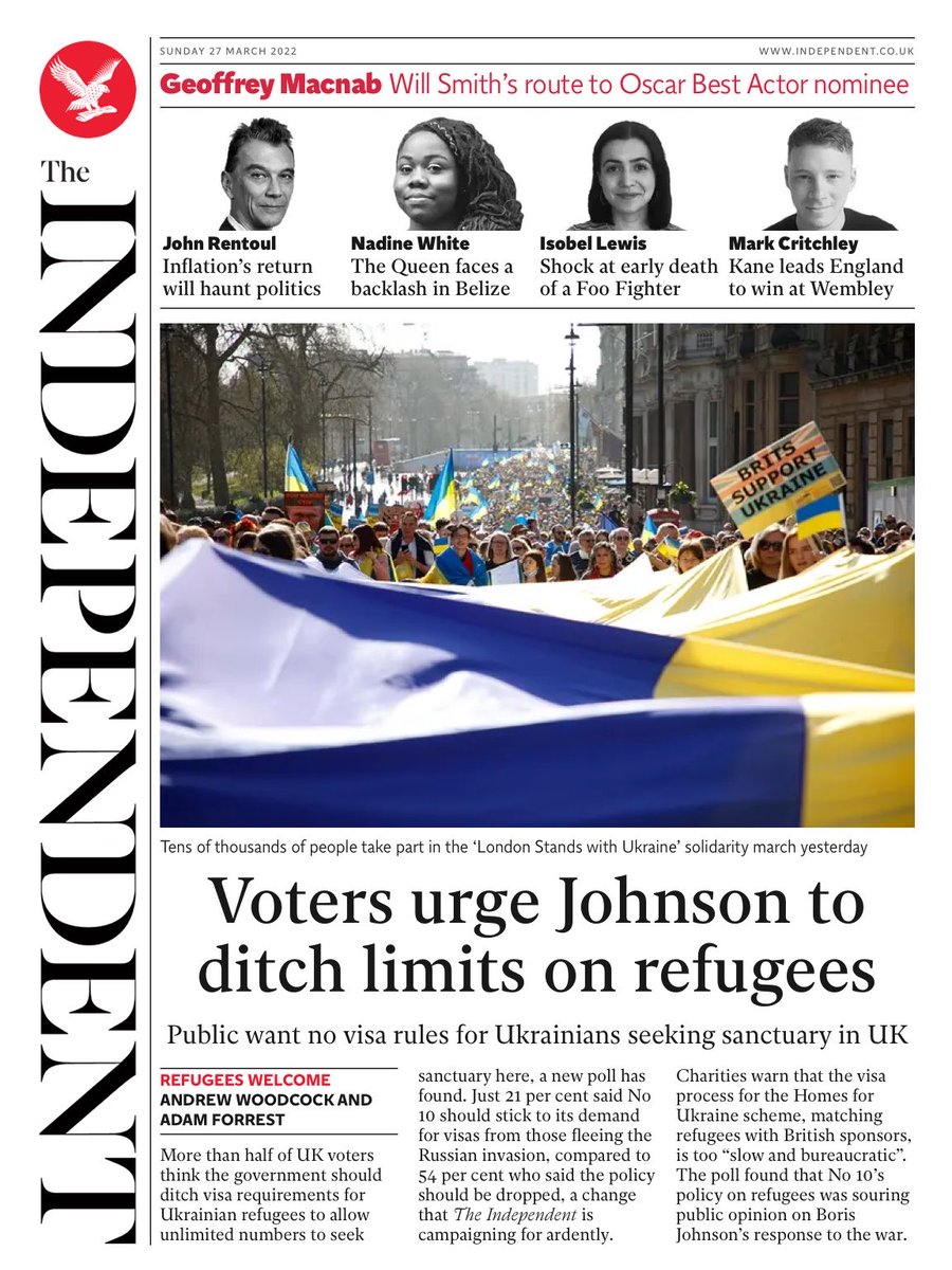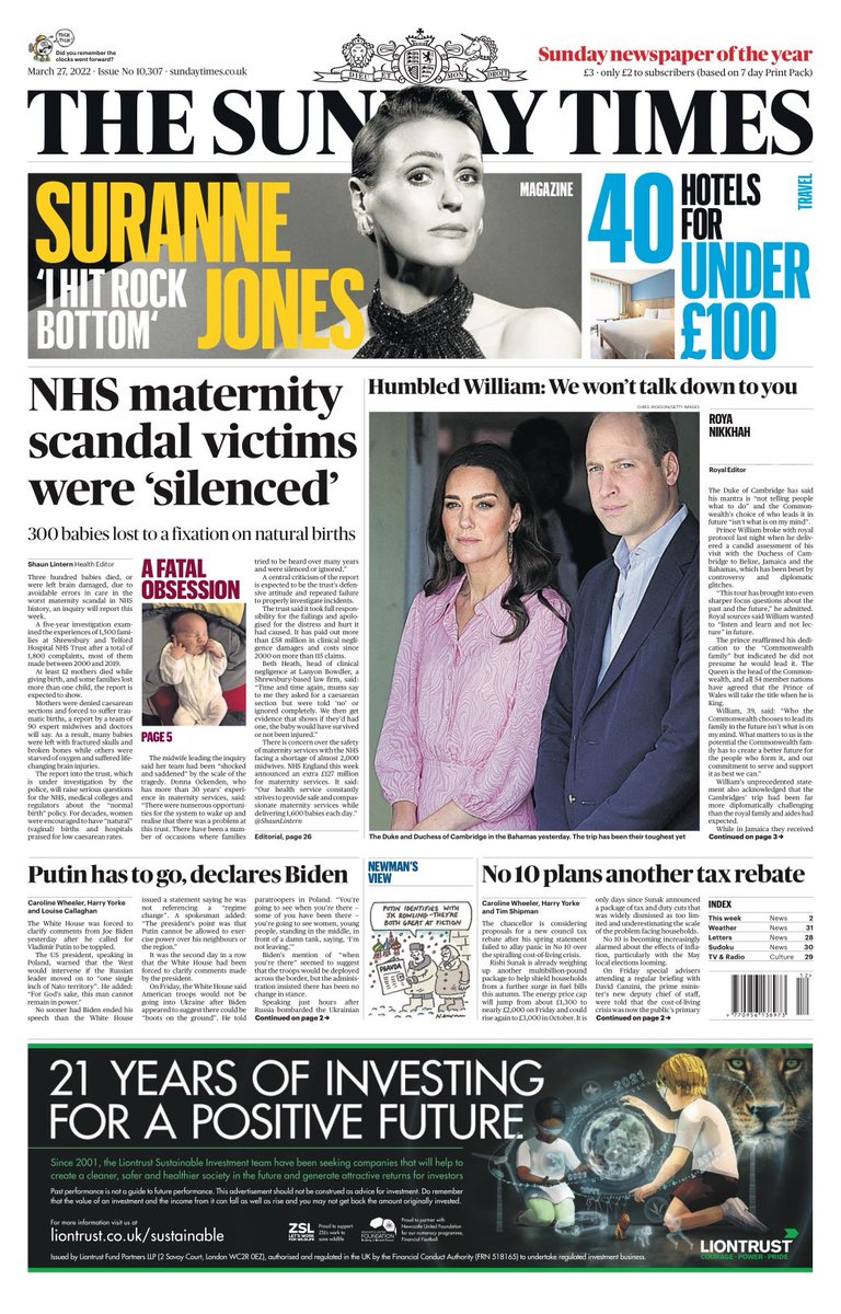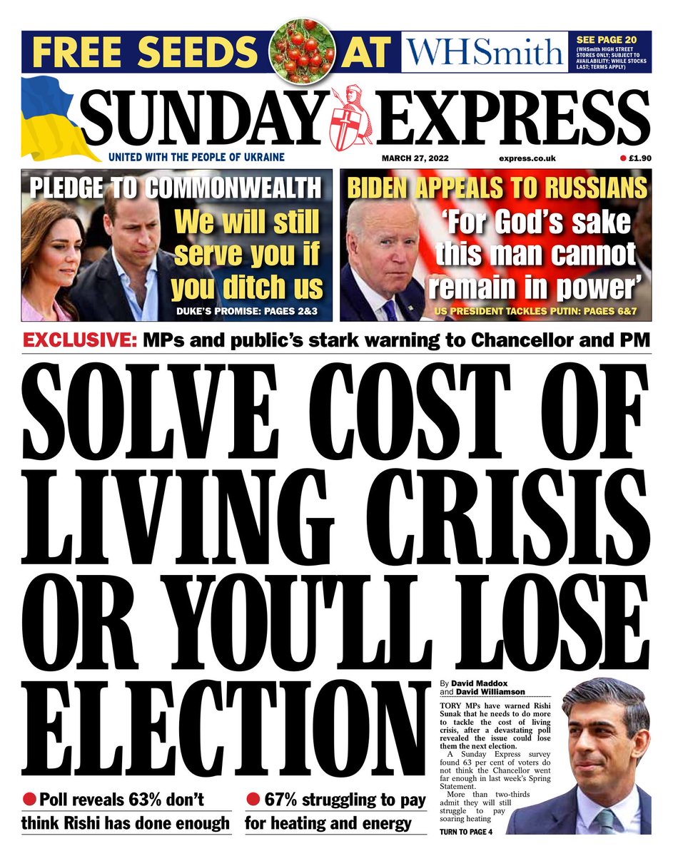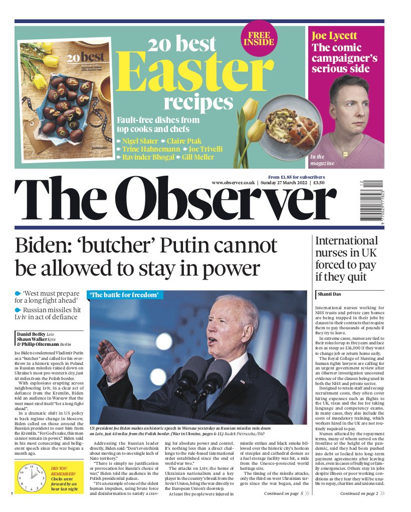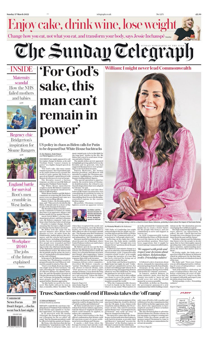 The Sunday Telegraph reports on US President Joe Biden saying Vladimir Putin should not be allowed to remain in power, but adds that the White House was forced to “back-track” when it appeared Mr Biden was calling for regime change in Russia.