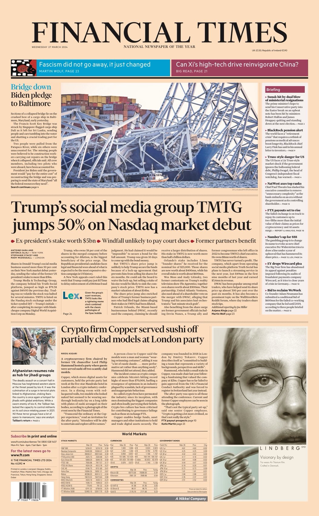 The Financial Times reports a 50% surge in TMTG shares, boosting Trump’s stake to over £3.