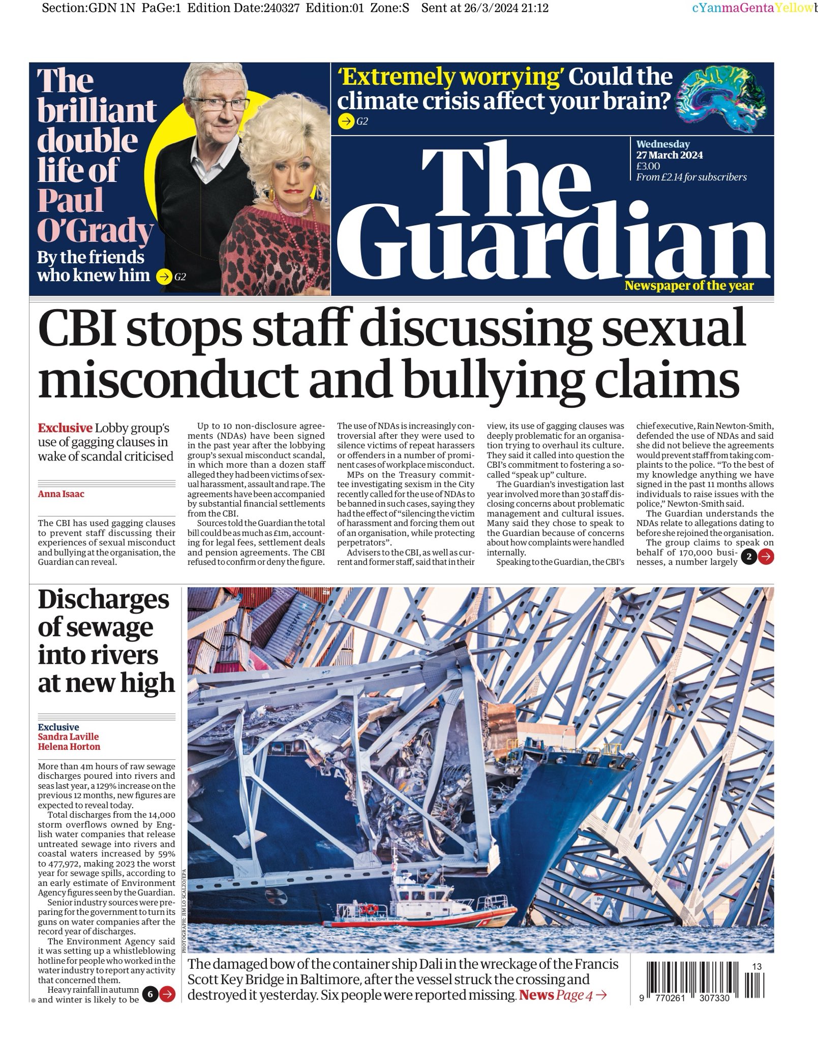 The Guardian reports on the CBI lobby group’s use of gagging orders to silence staff over sexual misconduct and bullying allegations.