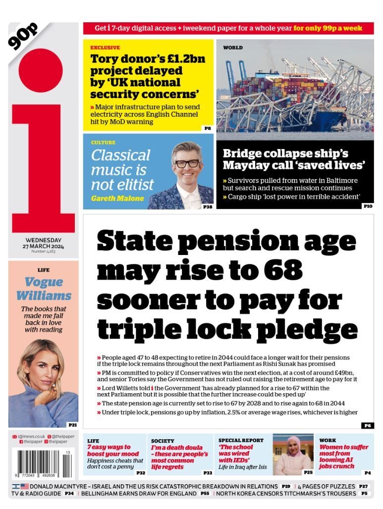 The i reveals potential rise in state pension age to 68 for funding Conservative’s pledge.