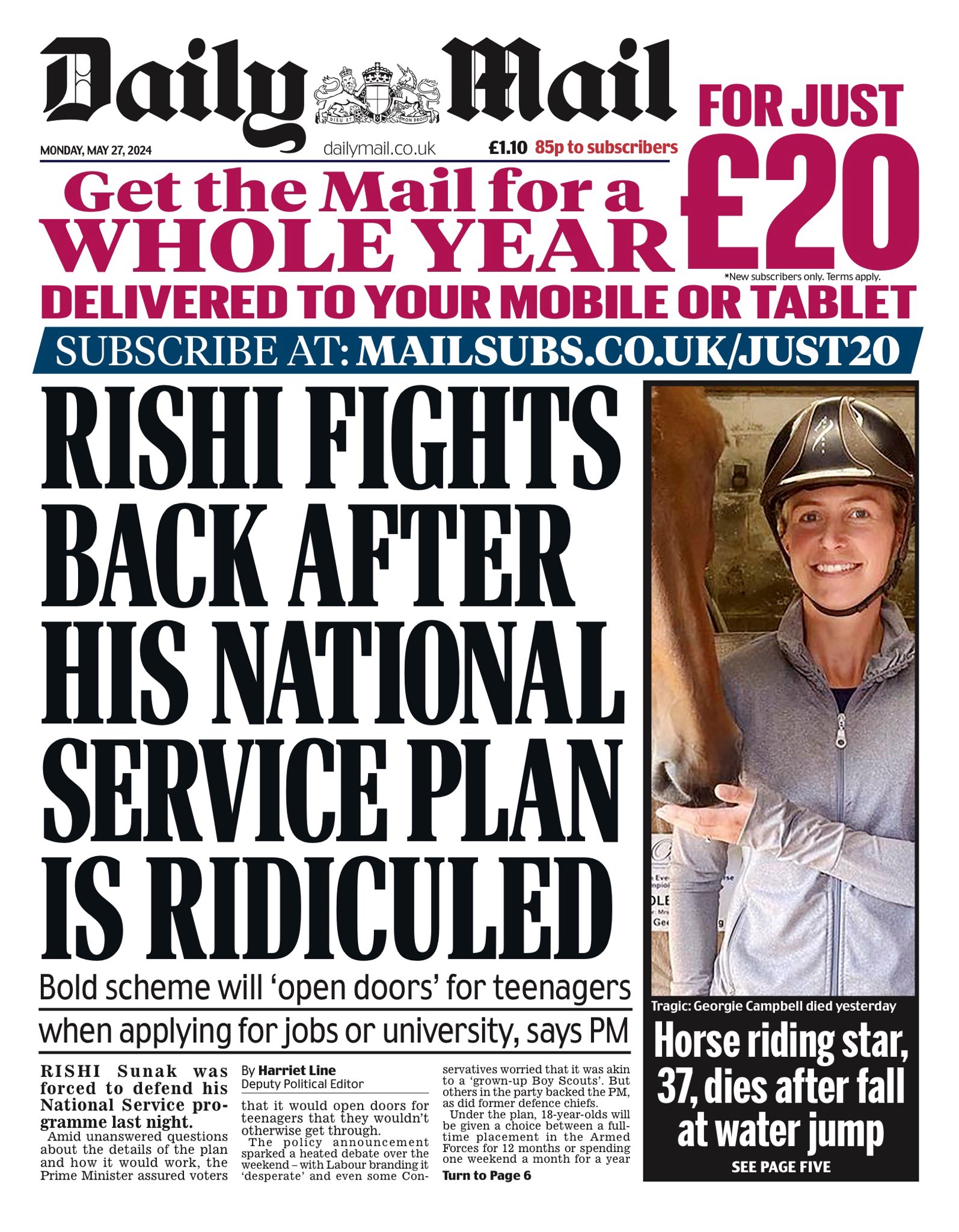 The Daily Mail reports on the mounting criticism of Rishi Sunak’s National Service revival plan.
