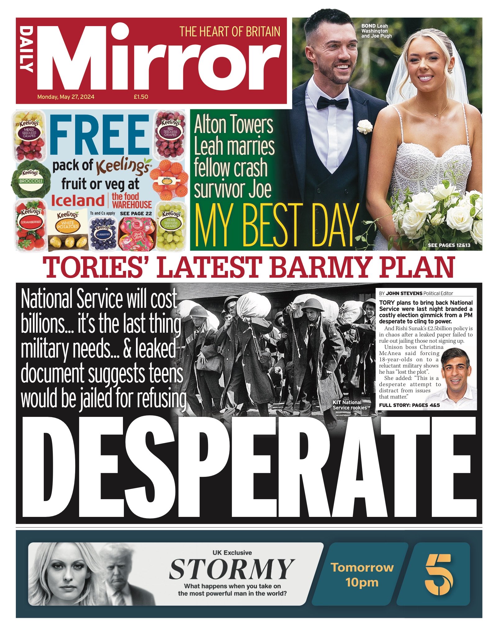 The Daily Mirror’s front page highlights the backlash against the Tory’s contentious proposal to reinstate National Service.
