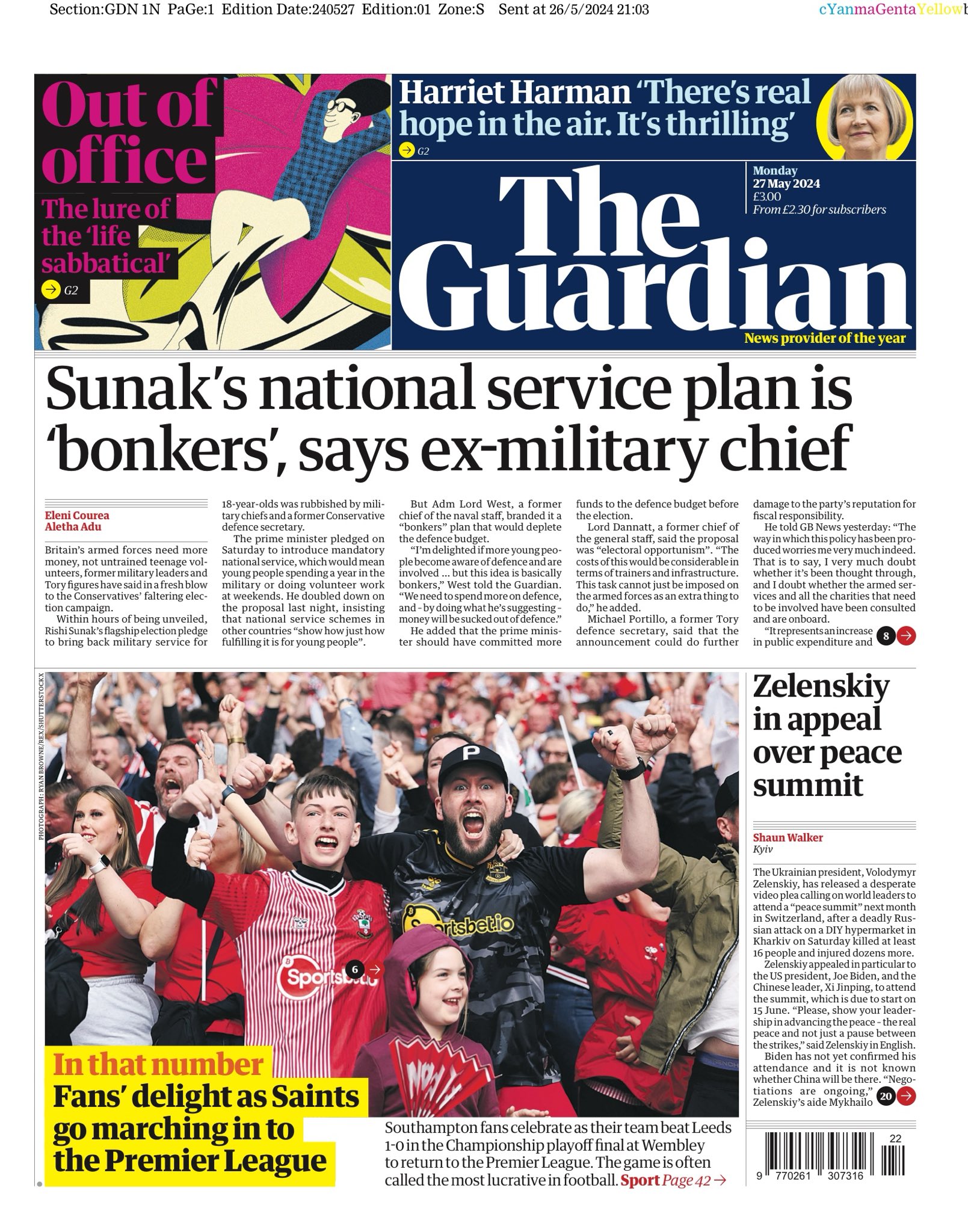 The Guardian’s front page highlights a former naval chief’s criticism of Rishi Sunak’s “bonkers” National Service revival pledge.
