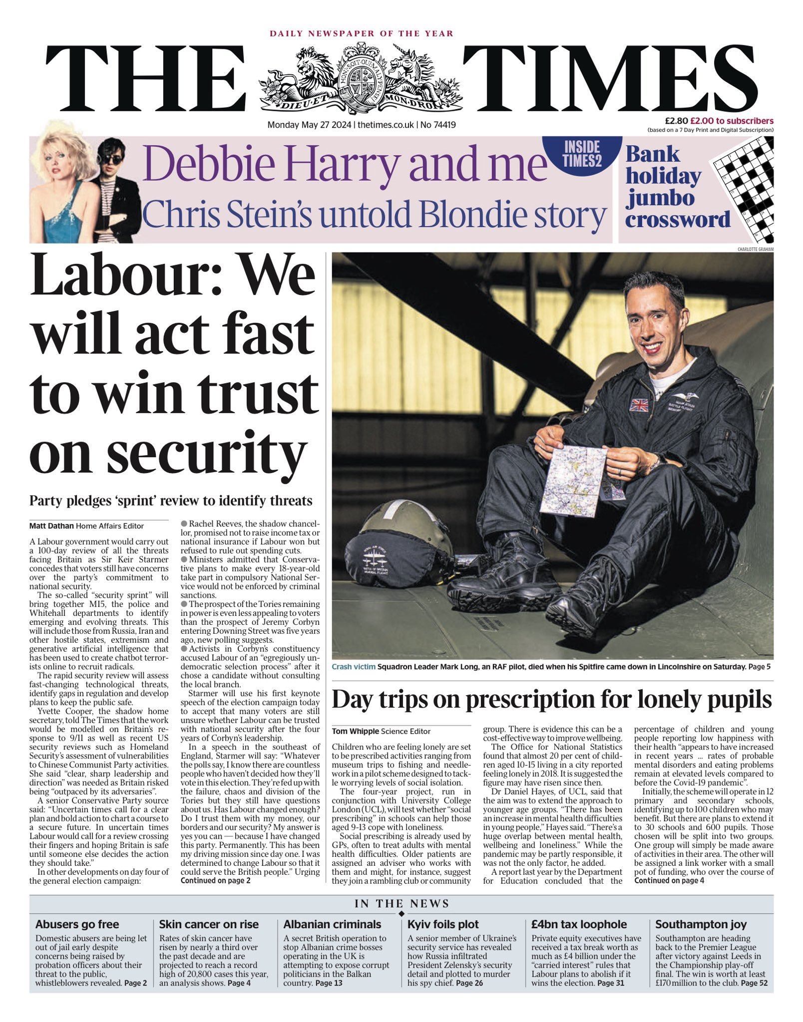 The Times reports on Labour’s proposed 100-day ‘security sprint’ to review UK threats, aiming to reassure voters of their dedication to national security.
