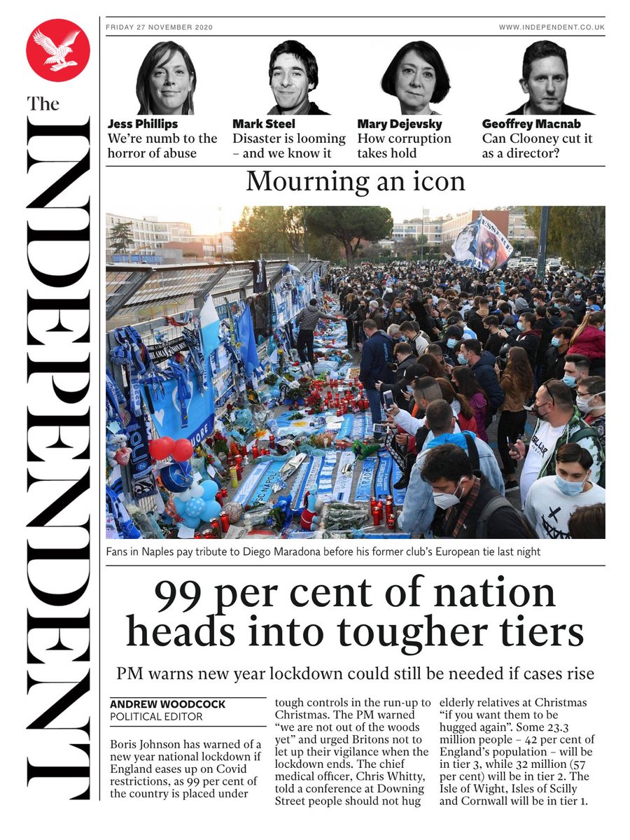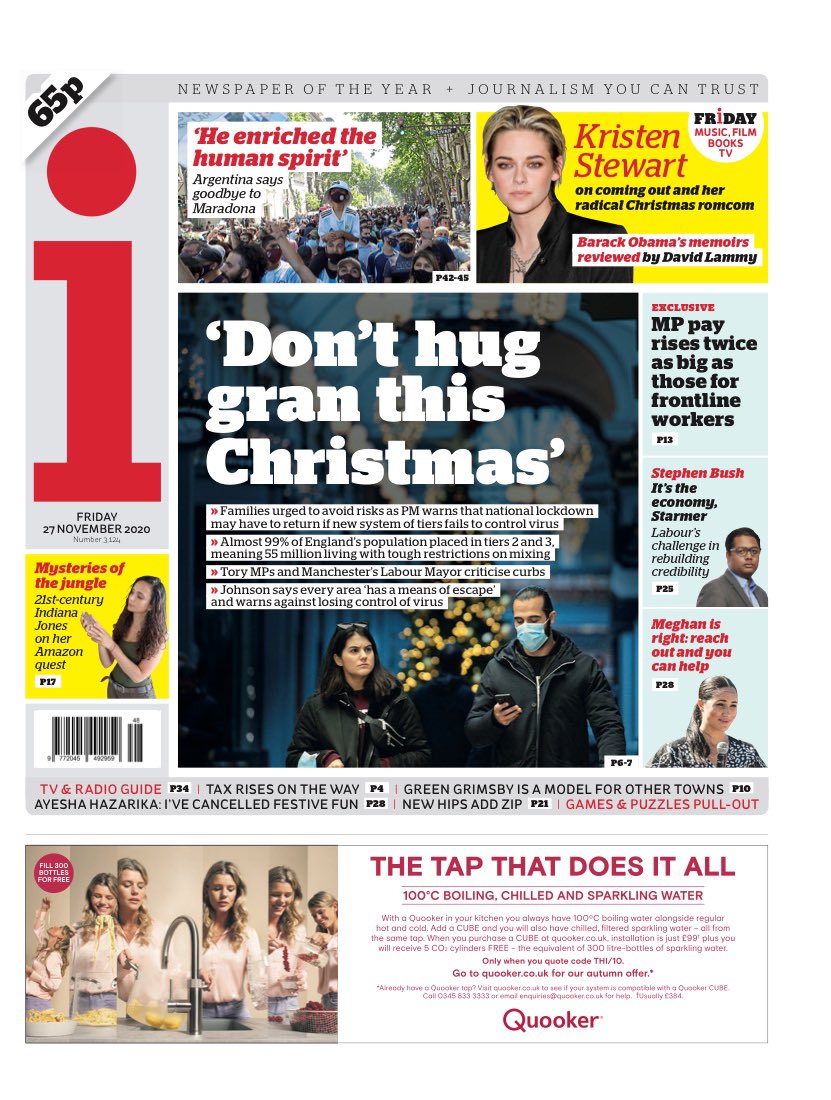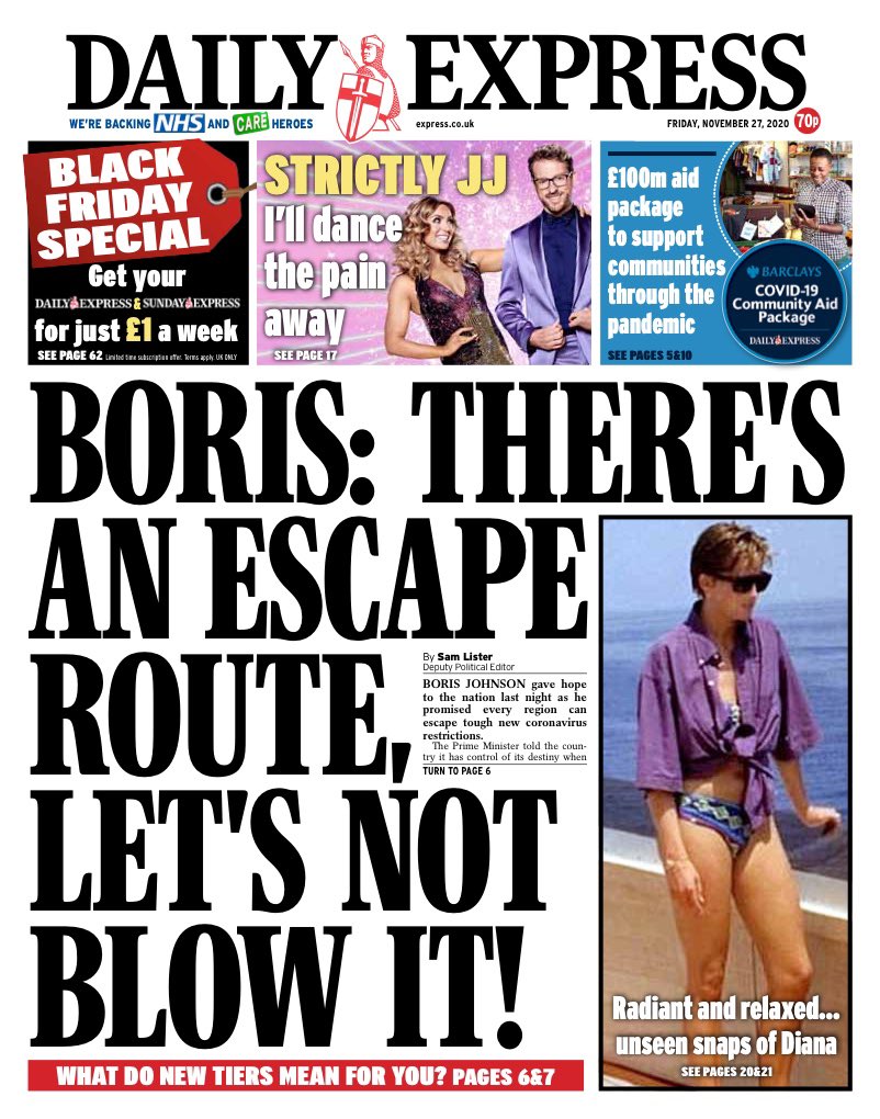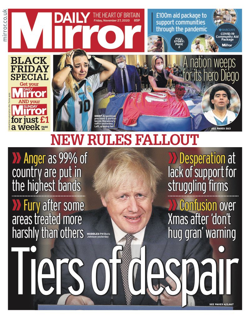 The Daily Mirror leads with the government’s revised post-lockdown restrictions, and goes with the headline “tiers of despair”.Read more on this story here.