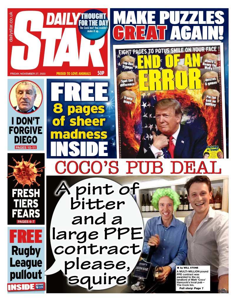 The Daily Star leads with claims a PPE contract was given to the former landlord of the health secretary’s local pub.