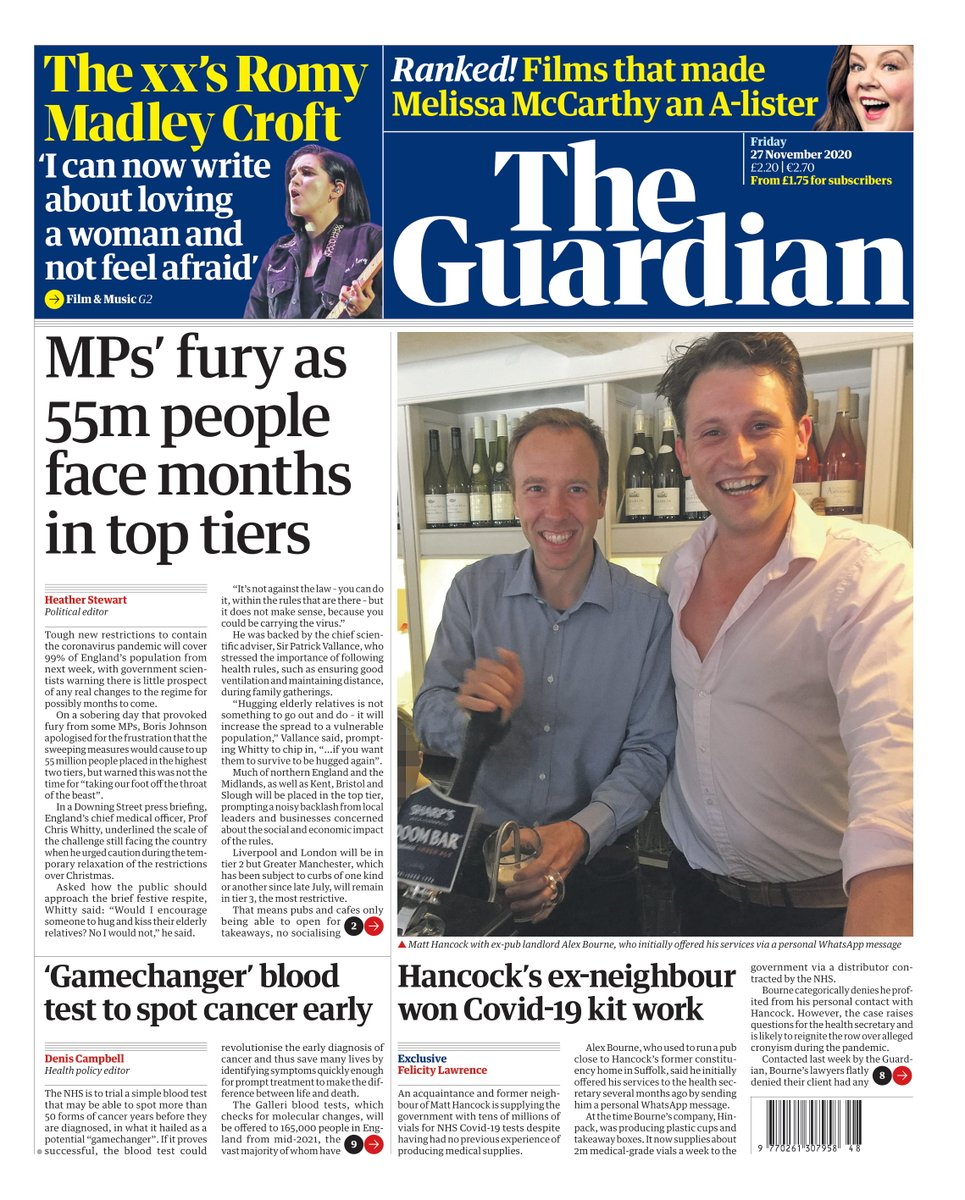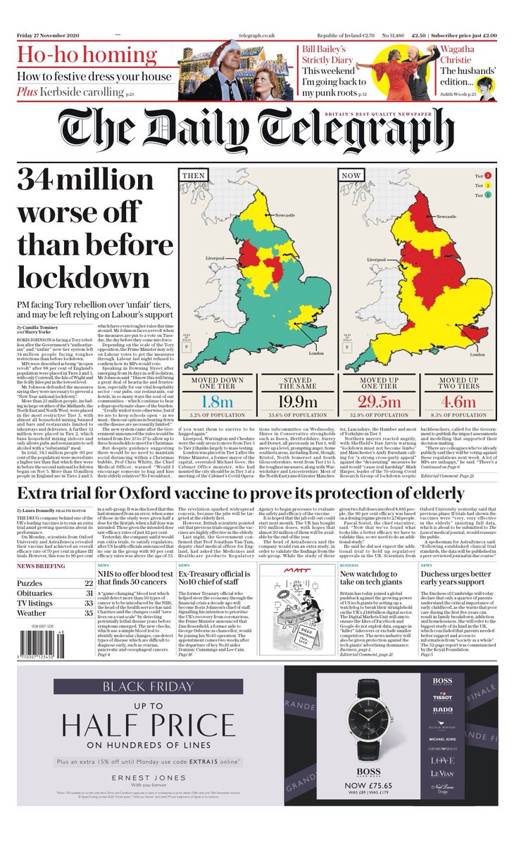 “34 million worse off than before lockdown,” reads the headline on the The Daily Telegraph, referring to the newly revealed tier system. Read more on this story here.