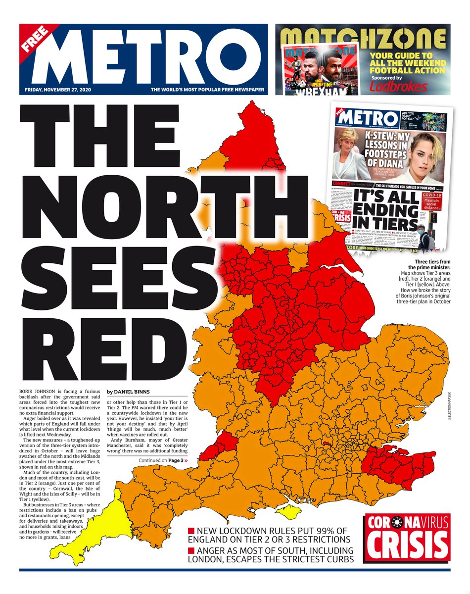Metro reports on the relaunched tier system and the fact that most of the North will be placed on the highest alert level.