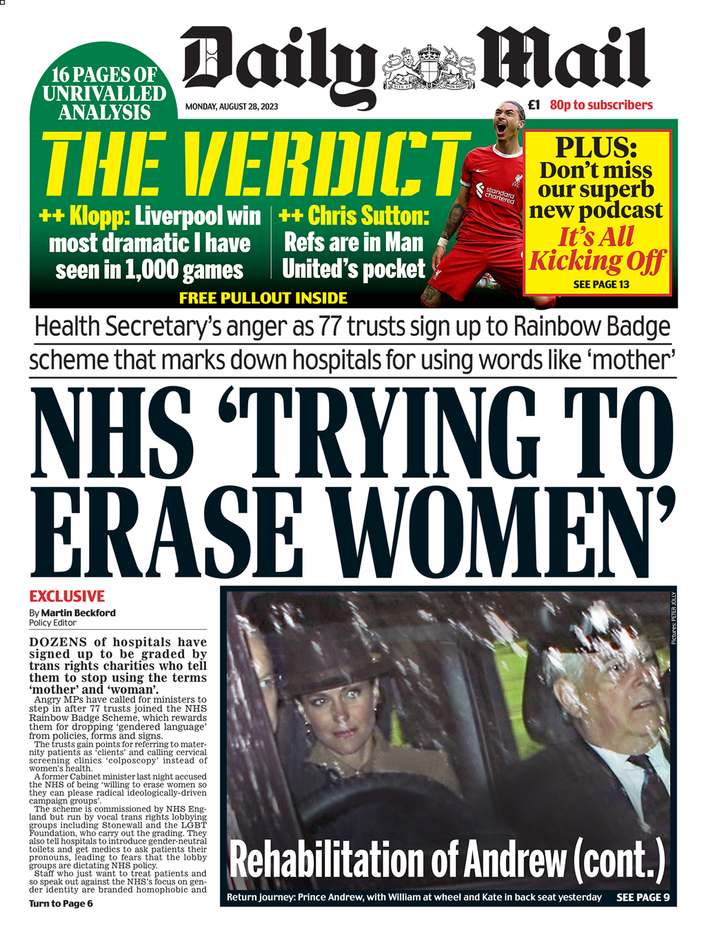 The NHS Rainbow Badge Scheme encourages hospitals to refrain from using gendered terms like ‘mother’ and ‘woman,’ reports the Daily Mail.
