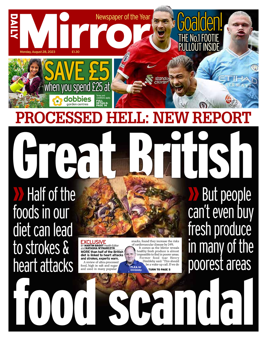 The Daily Mirror focuses on a study associating ultra-processed foods with increased risks of stroke, heart attack, and high blood pressure.