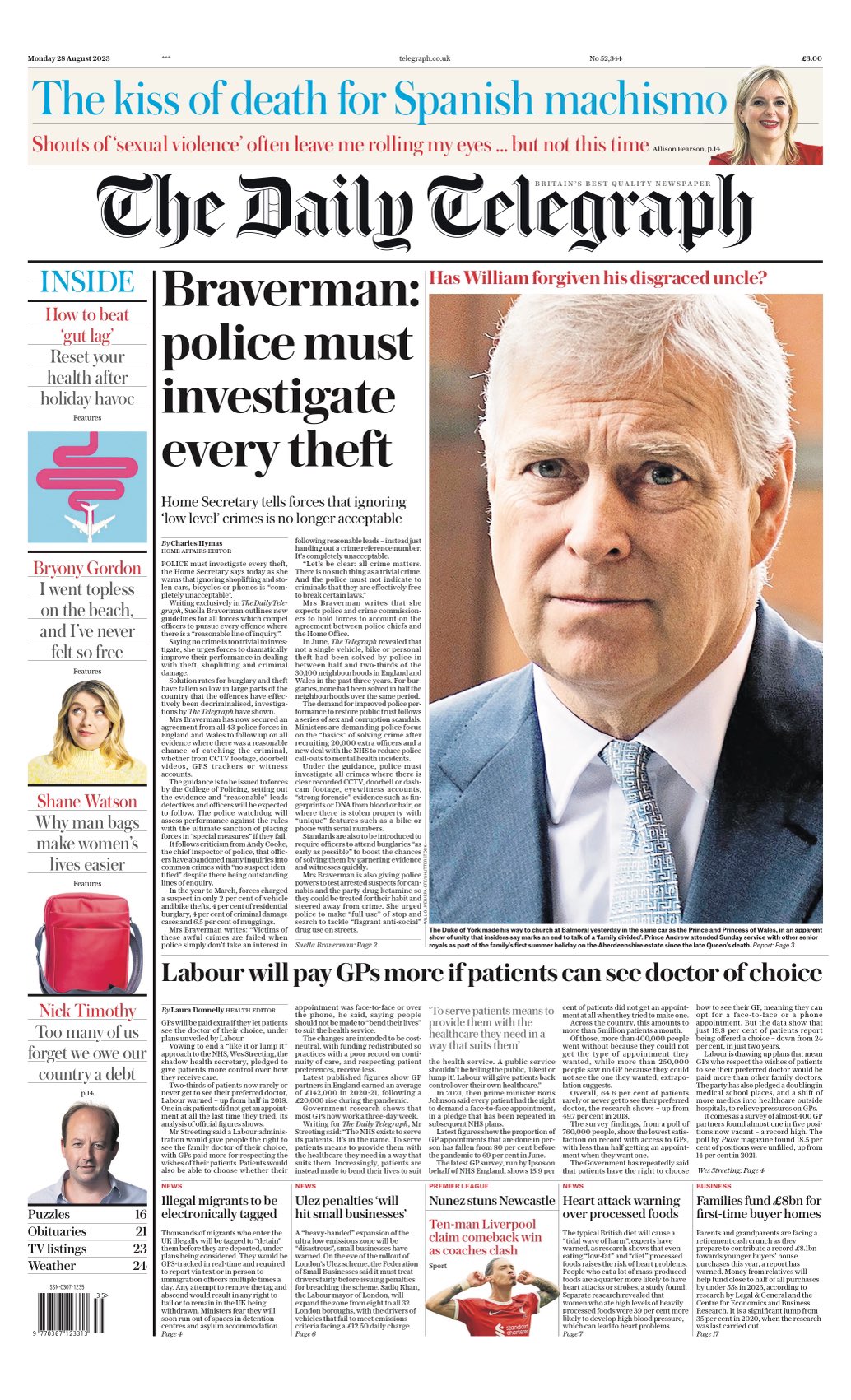 Home Secretary Suella Braverman mandates police forces in England and Wales to probe all theft reports, states The Daily Telegraph.