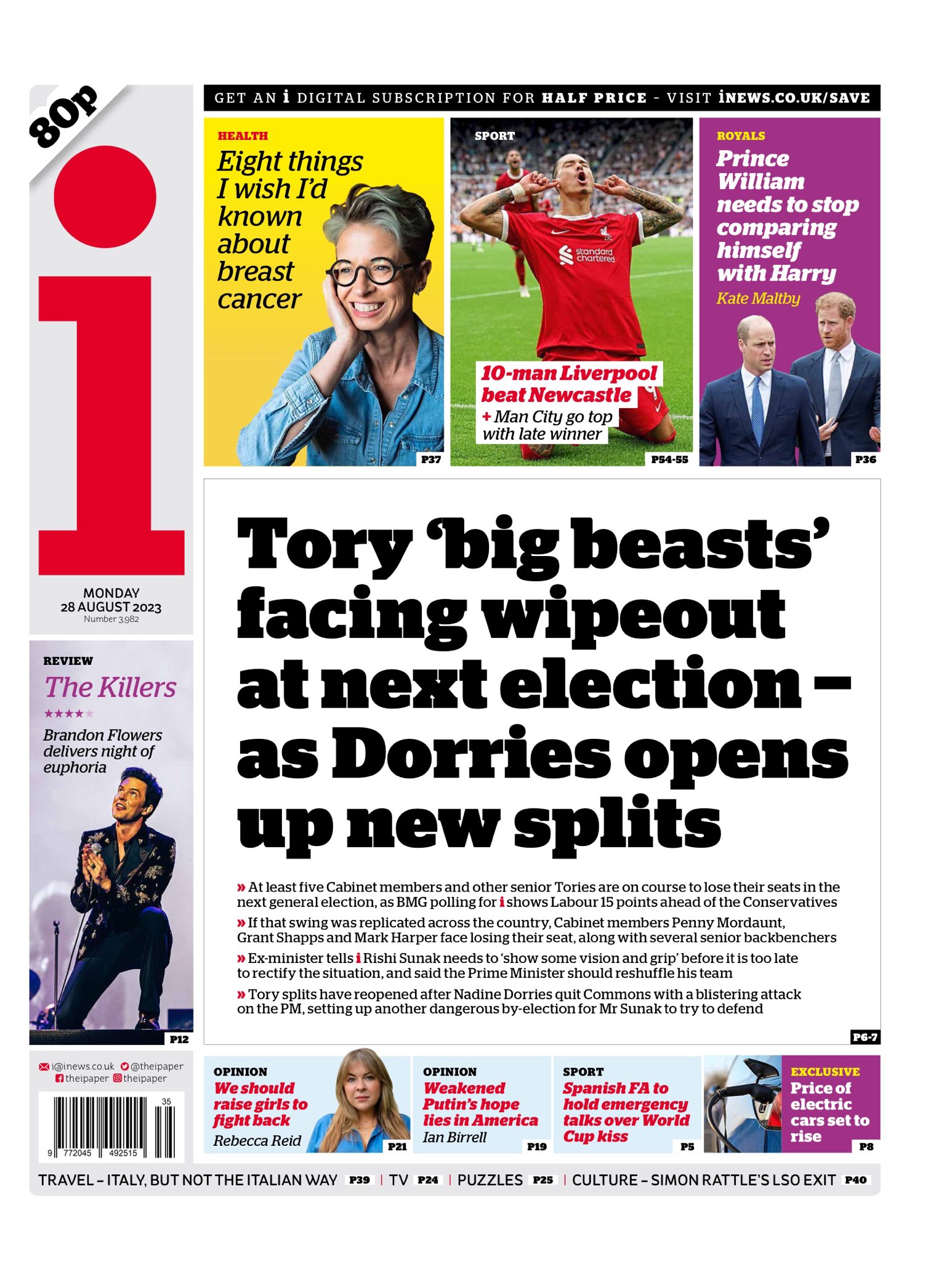 A poll in the i suggests senior Tories, including five cabinet members, risk losing seats in the next General Election, with Labour leading by 15 points.