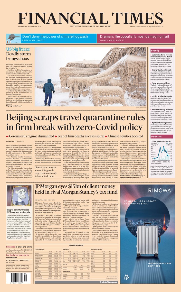 The Financial Times reports that China will remove COVID quarantine requirements for inbound travellers on 8 January.