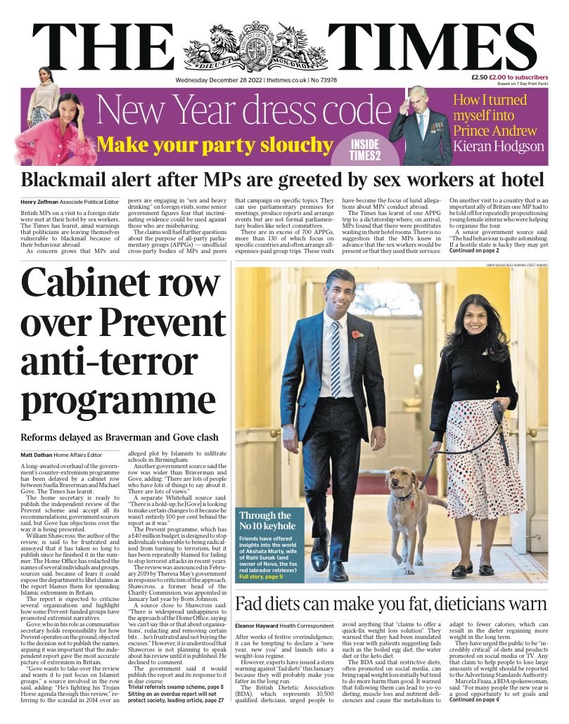 The Times reports that a row between cabinet ministers Suella Braverman and Michael Gove has delayed government’s counter-extremism program, Prevent.