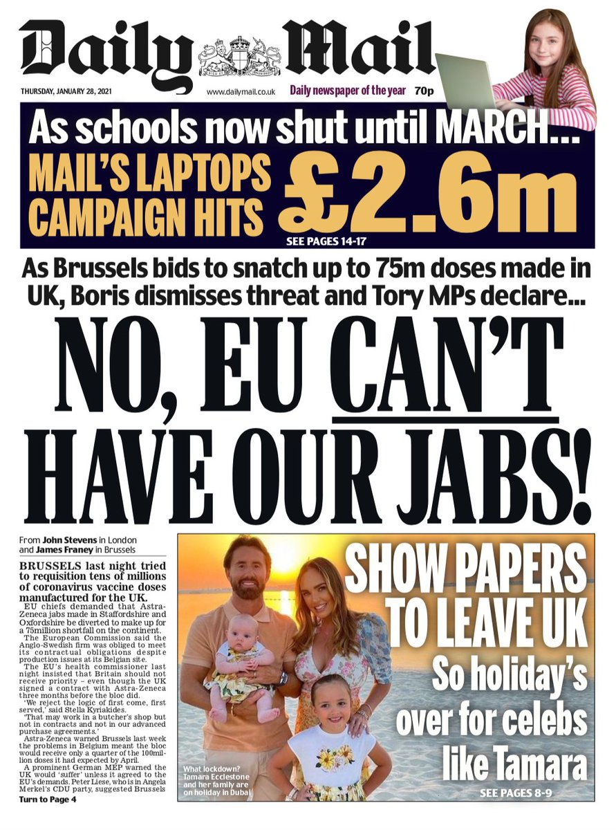 The Daily Mail says EU chiefs are demanding that AstraZeneca COVID vaccine doses made in the UK be diverted to make up for a 75m shortfall on the continent.