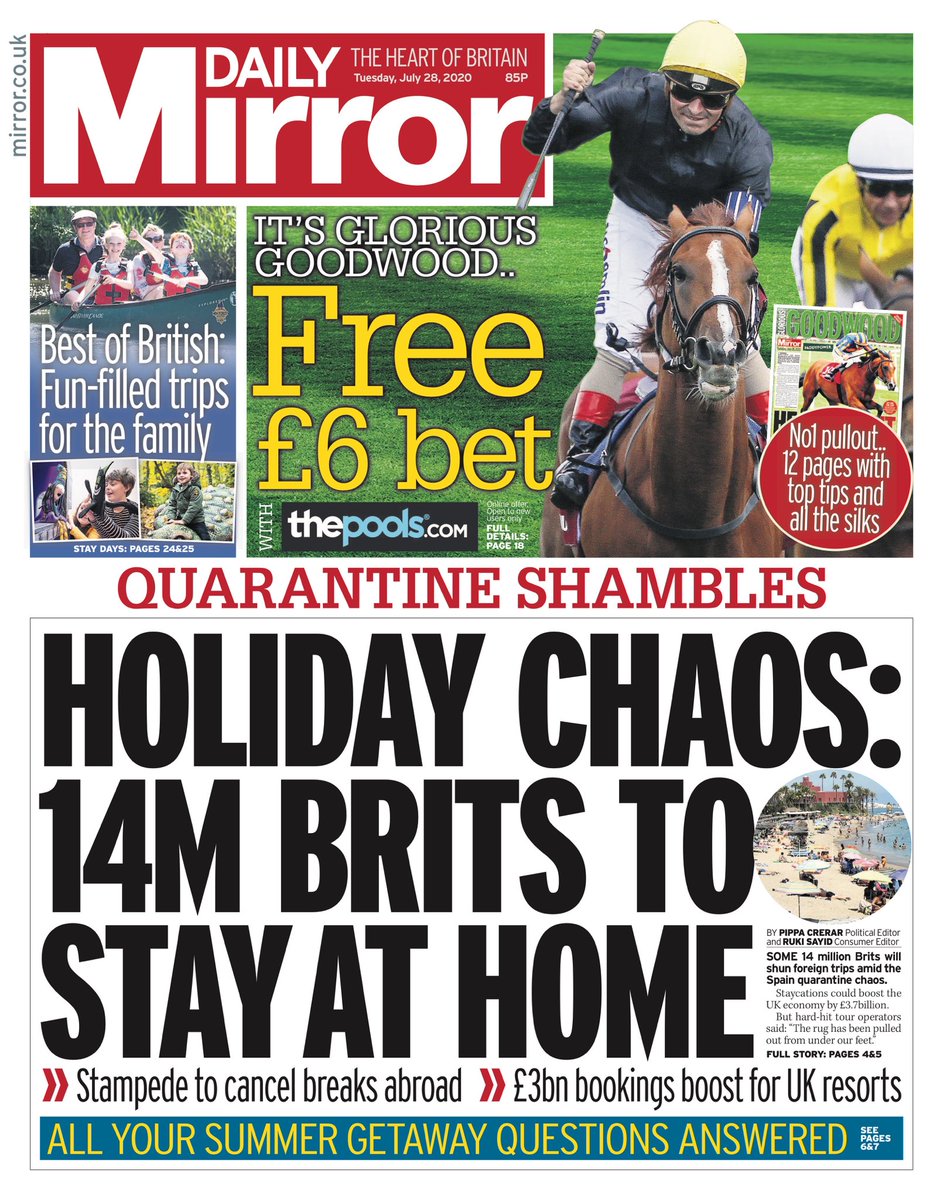 With Britons potentially avoiding a holiday abroad this summer, the Daily Mirror says “staycations” could boost the national economy by £3.7bn.