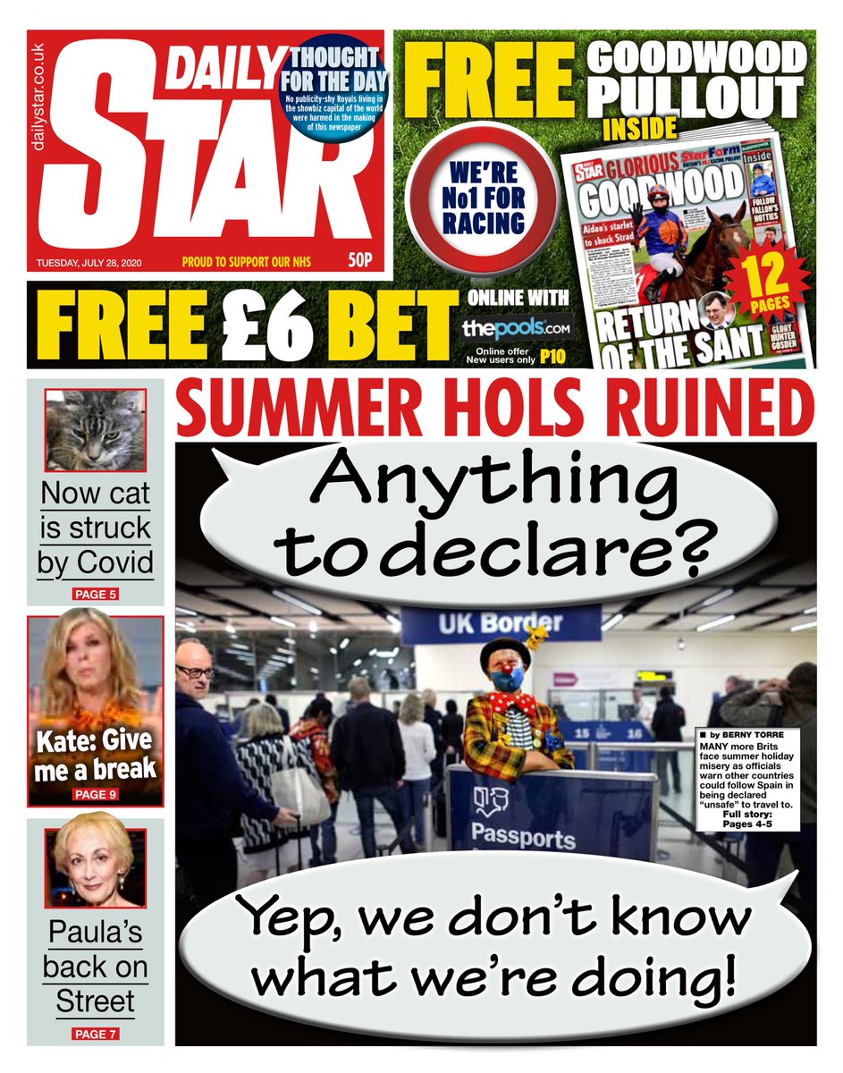 On the front of the i is Downing Street’s warning that all foreign travel could be at risk this summer.