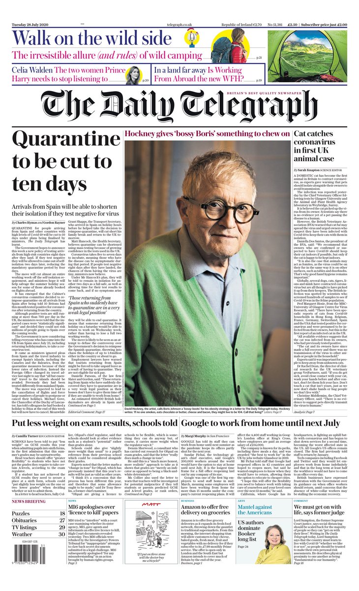 Self-isolation requirements for people arriving in the UK from Spain and other high-risk coronavirus countries could eventually be shortened to 10 days if they test negative for the illness, The Daily Telegraph reports.