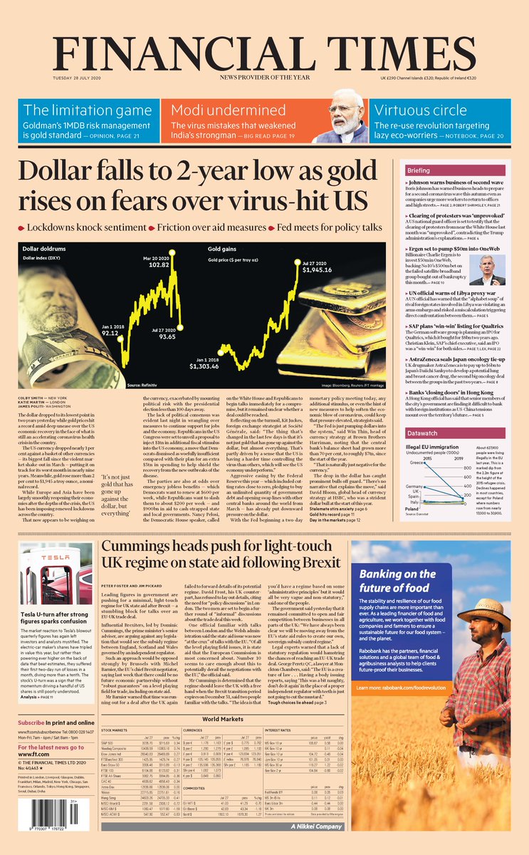On the front of the Financial Times, the US dollar has dropped to a two-year low and is now on track for its worst month in nearly a decade.