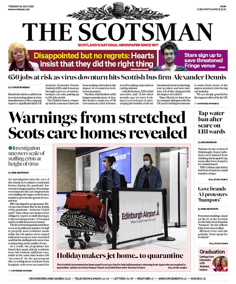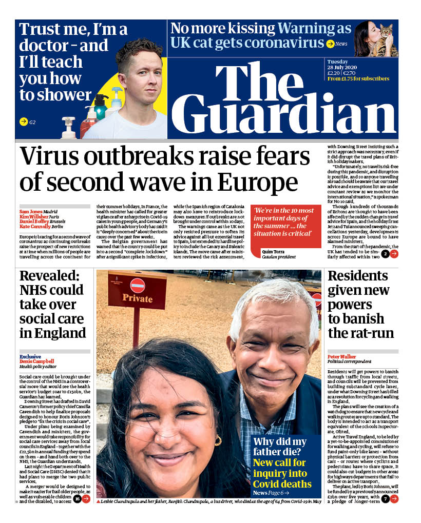 The Guardian leads with Europe’s concerns over a second wave of COVID-19 as fresh outbreaks increase the possibility of imposing new restrictions.