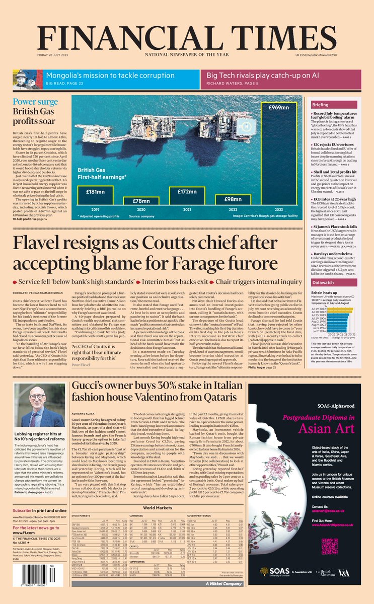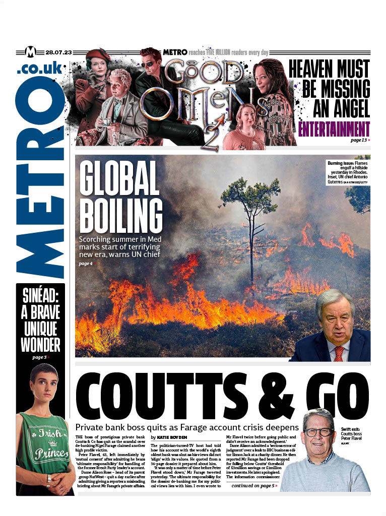 Metro covers the resignation of Coutts’ CEO Peter Flavel, an outcome of the controversy over the handling of Nigel Farage’s banking account.