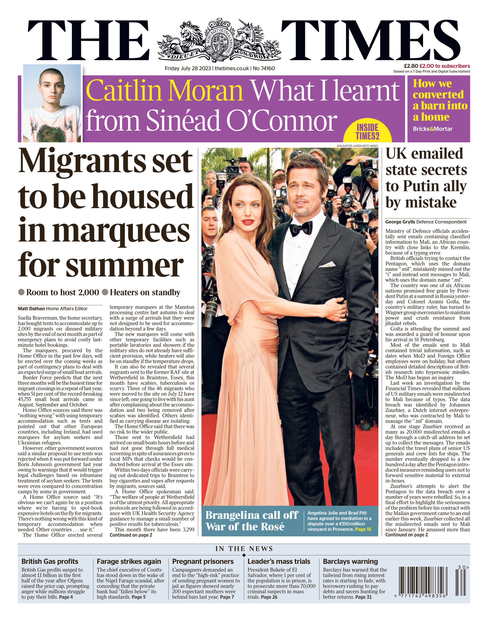 In The Times, it’s reported that Home Secretary Suella Braverman has acquired tents to host up to 2,000 migrants on decommissioned military sites within a month.