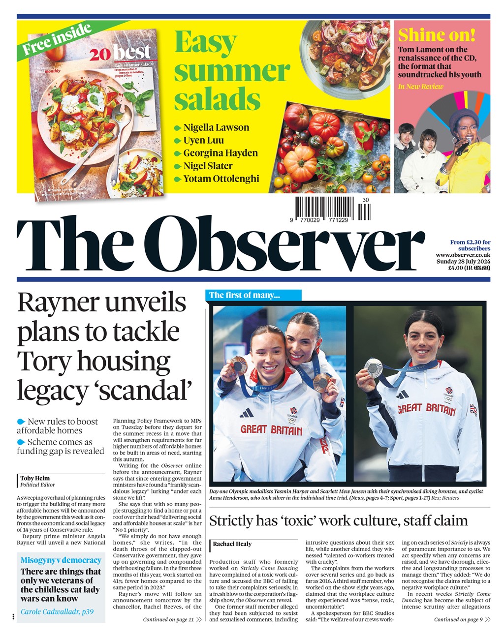 The Observer reports on significant government plans to revise planning regulations, aiming to increase the construction of affordable housing, with an announcement expected this week.