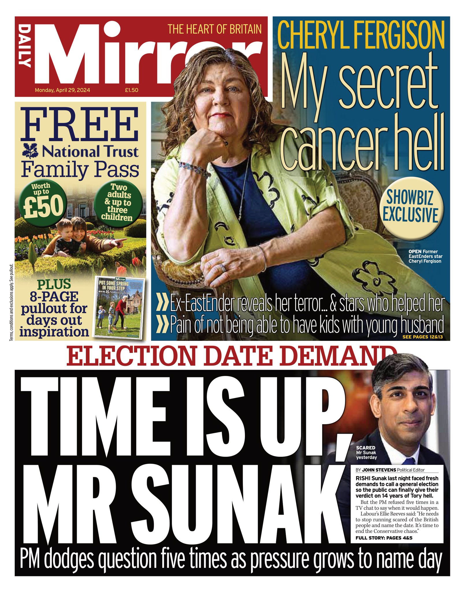 The Daily Mirror highlights Rishi Sunak’s refusal to dismiss potential general election in Sky News interview.