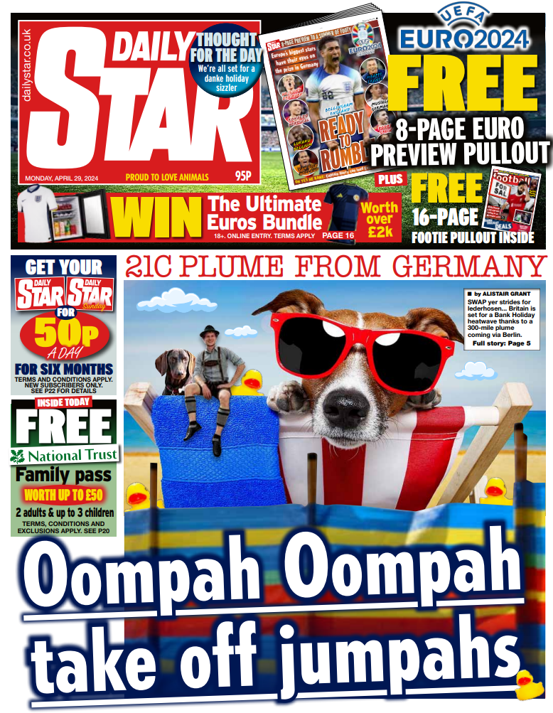 The Daily Star predicts a bank holiday heatwave for Britain as warm weather from Germany is expected to sweep the UK.