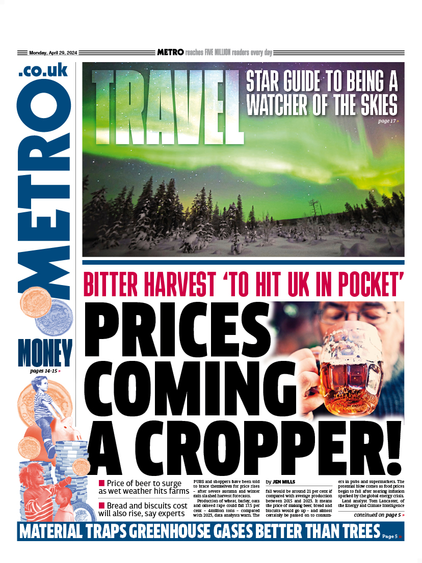 The Metro highlights an anticipated increase in the cost of beer, bread, and biscuits due to a poor harvest.