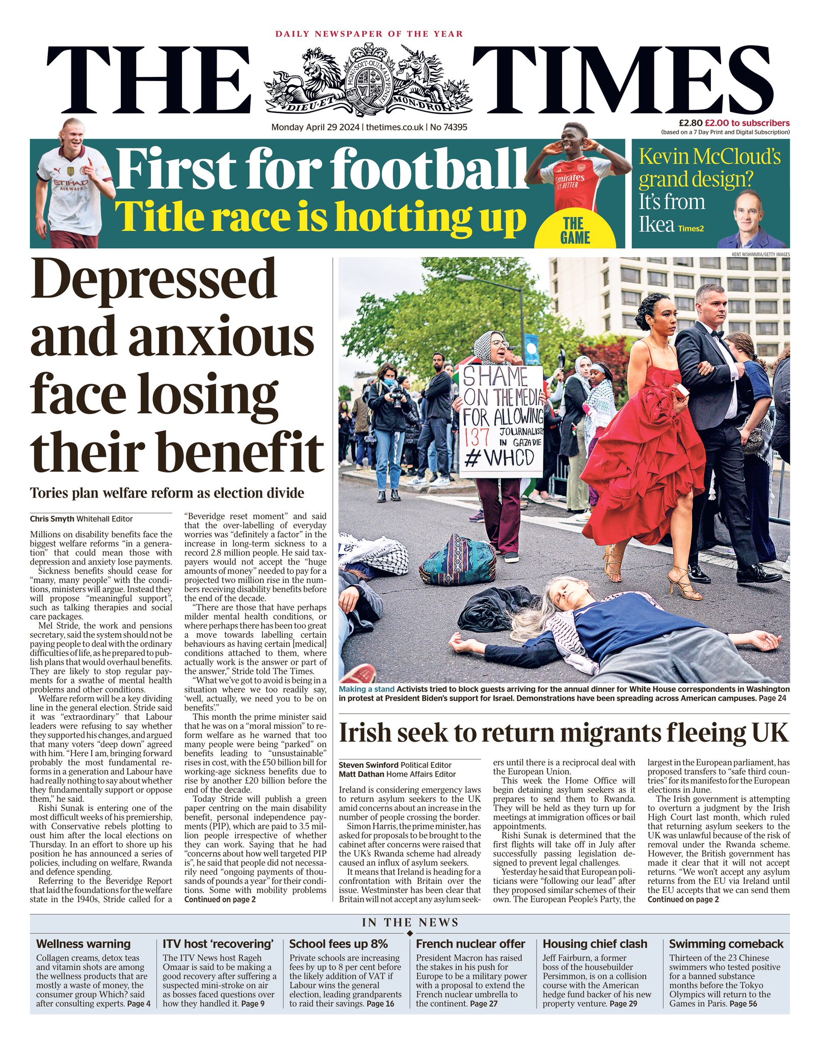 The Daily Telegraph highlights the UK government’s criticism of the EU’s migrant policies, following Ireland’s pledge to return asylum seekers crossing from Northern Ireland.