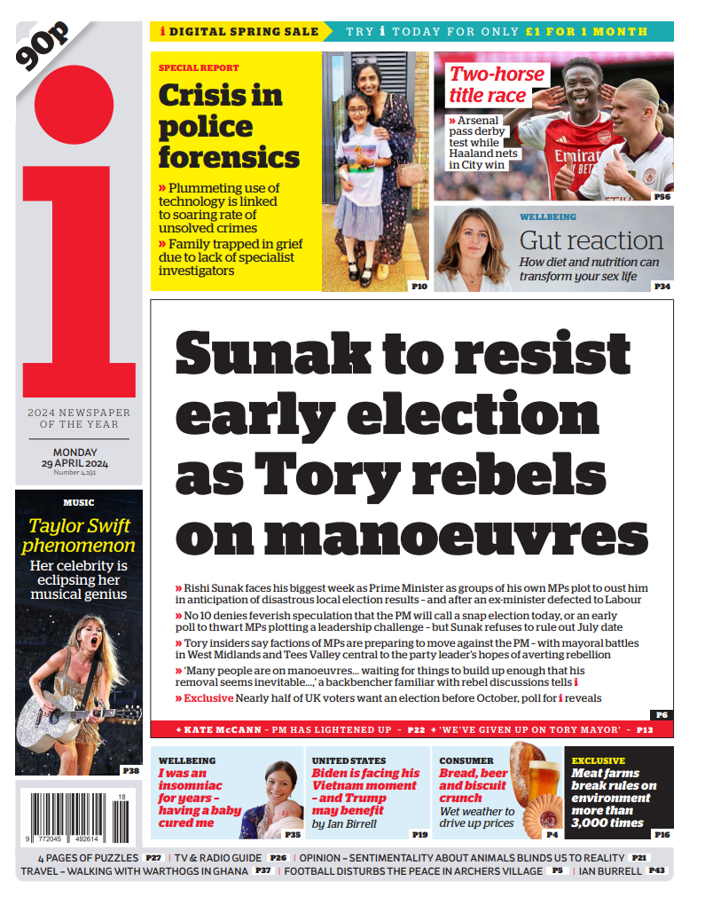 The i paper discloses PM Rishi Sunak’s strategy to dodge a sudden general election.