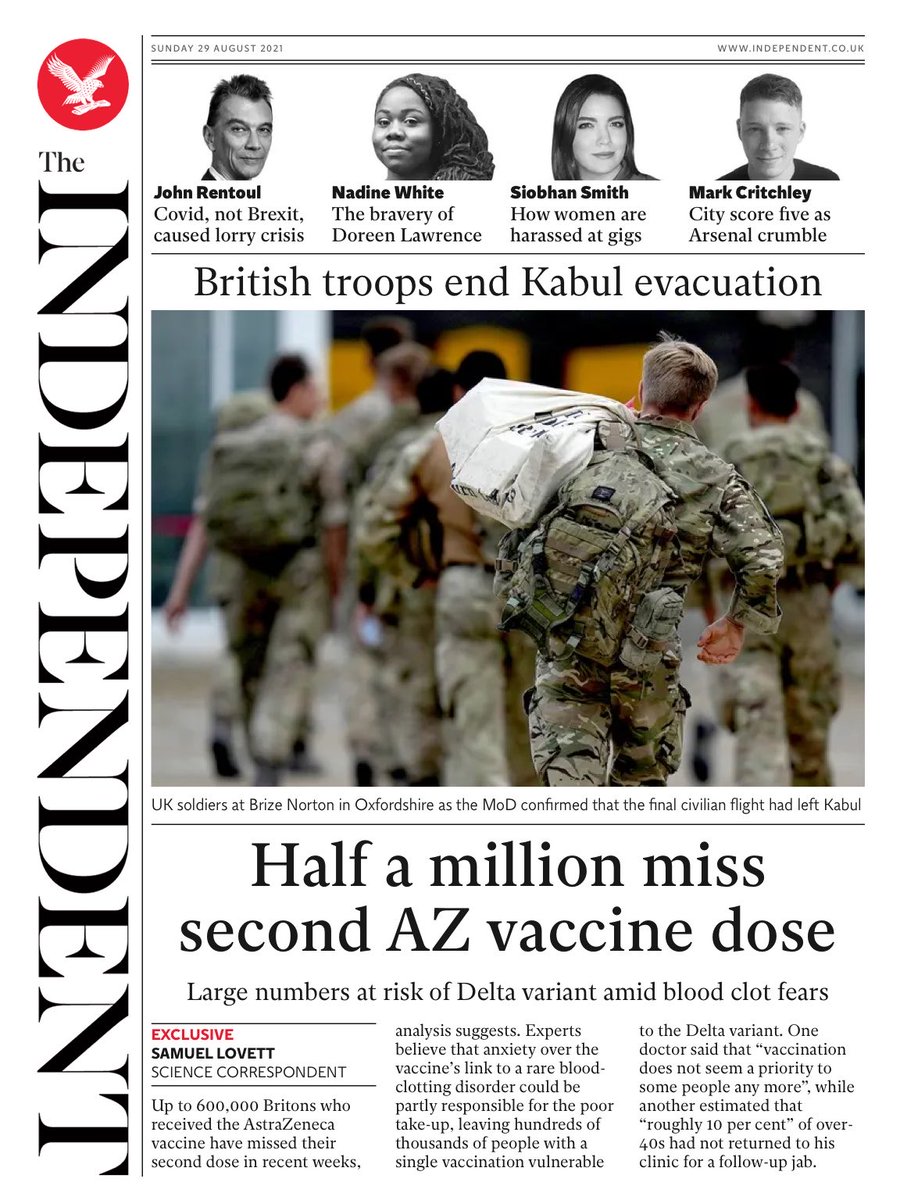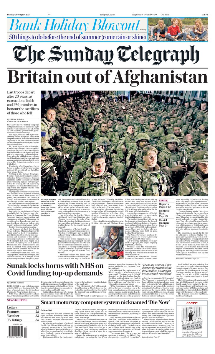 Britain out of Afghanistan – that’s the headline on the front of The Sunday Telegraph, as the final troops finally leave the country after 20 years.
