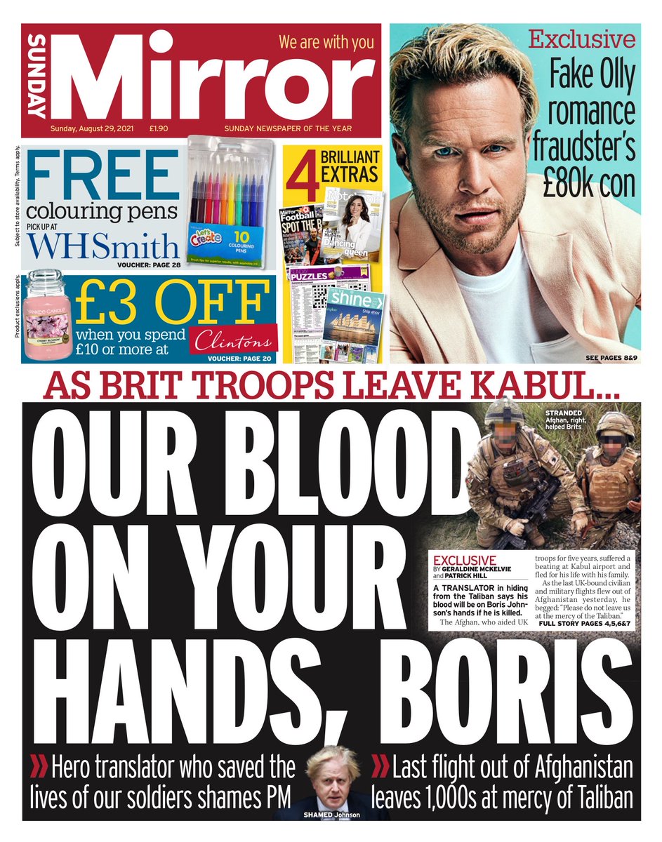 The Sunday Mirror has an interview with an Afghan translator who worked with British troops and tried to get out of the country but was beaten by the Taliban and is now in hiding. He pleads: “Please do not leave us at the mercy of the Taliban.”