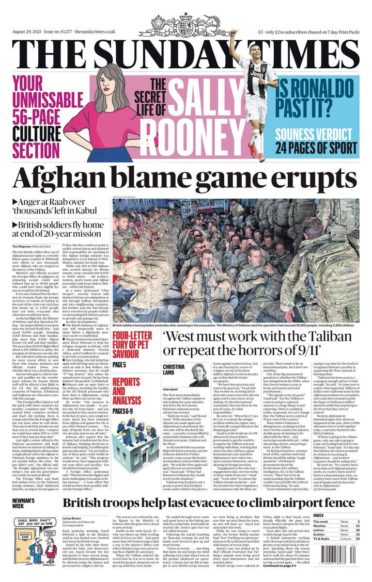 The Sunday Times leads with the beginning of the “Afghan blame game”, following the departure of British troops from the country.