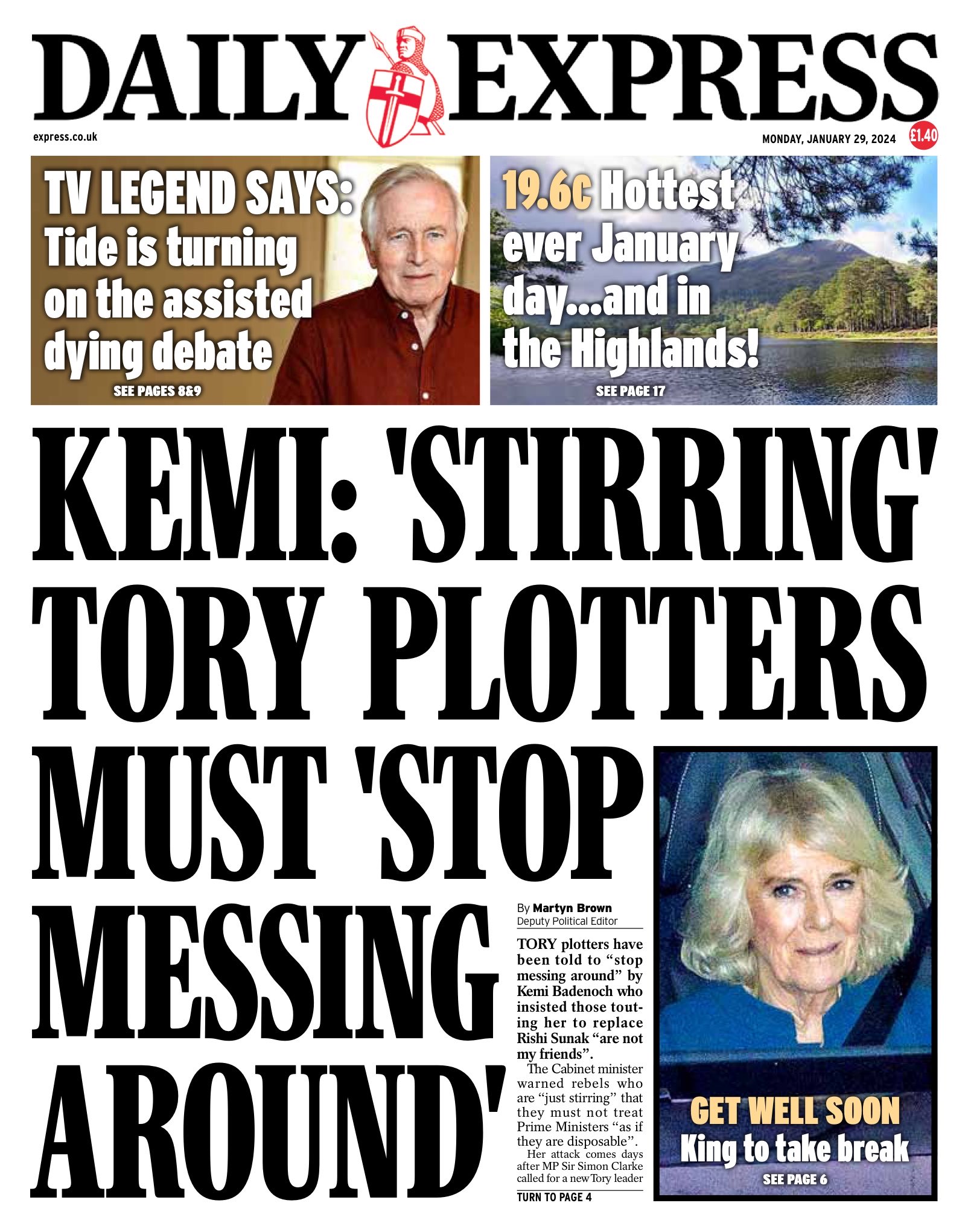 The Daily Express reports on Business Secretary Kemi Badenoch’s plea to Conservative Party rebels to cease their disruptive behaviour.