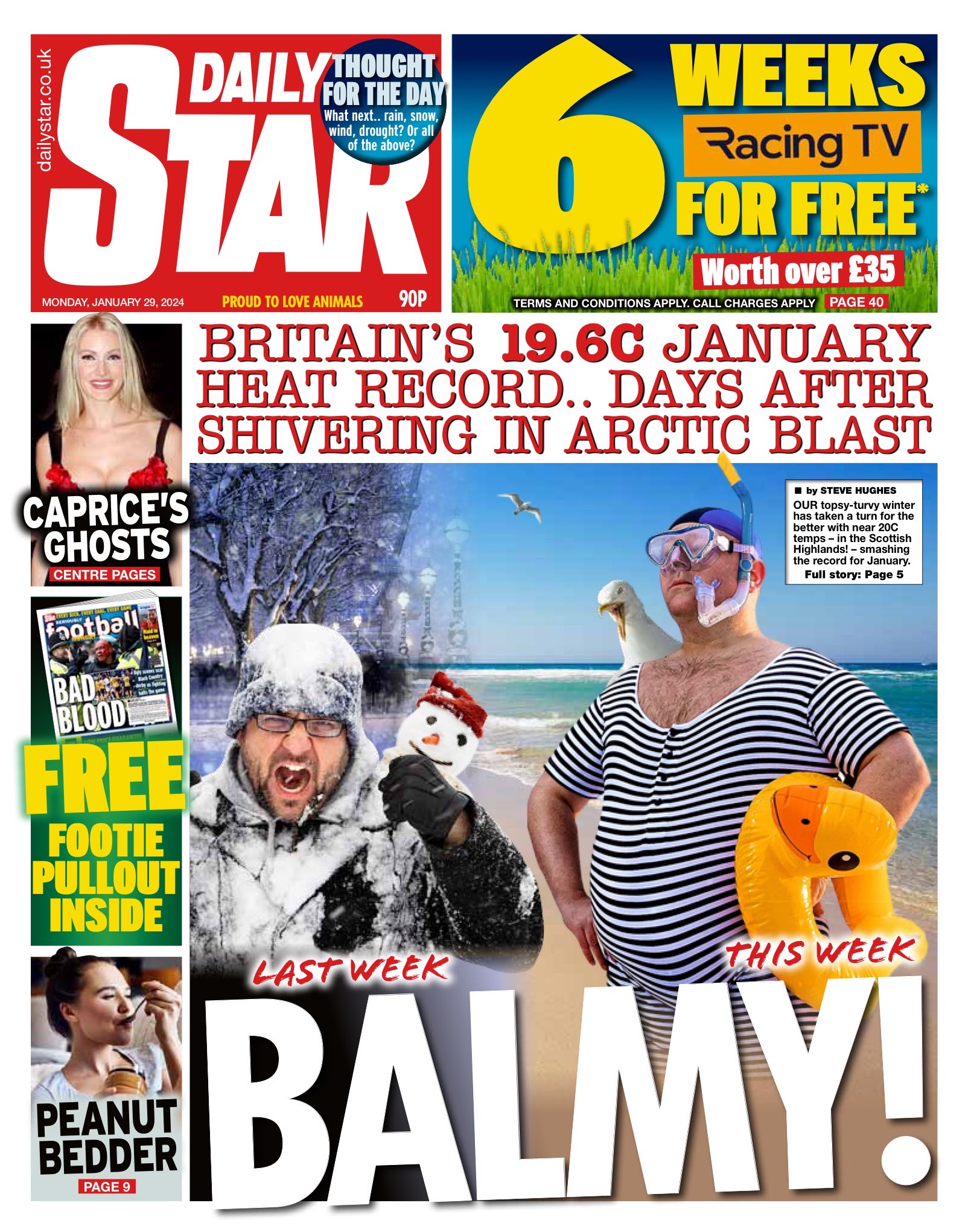 The Daily Star reports on Britain experiencing its warmest January day on record, with temperatures reaching 19.
