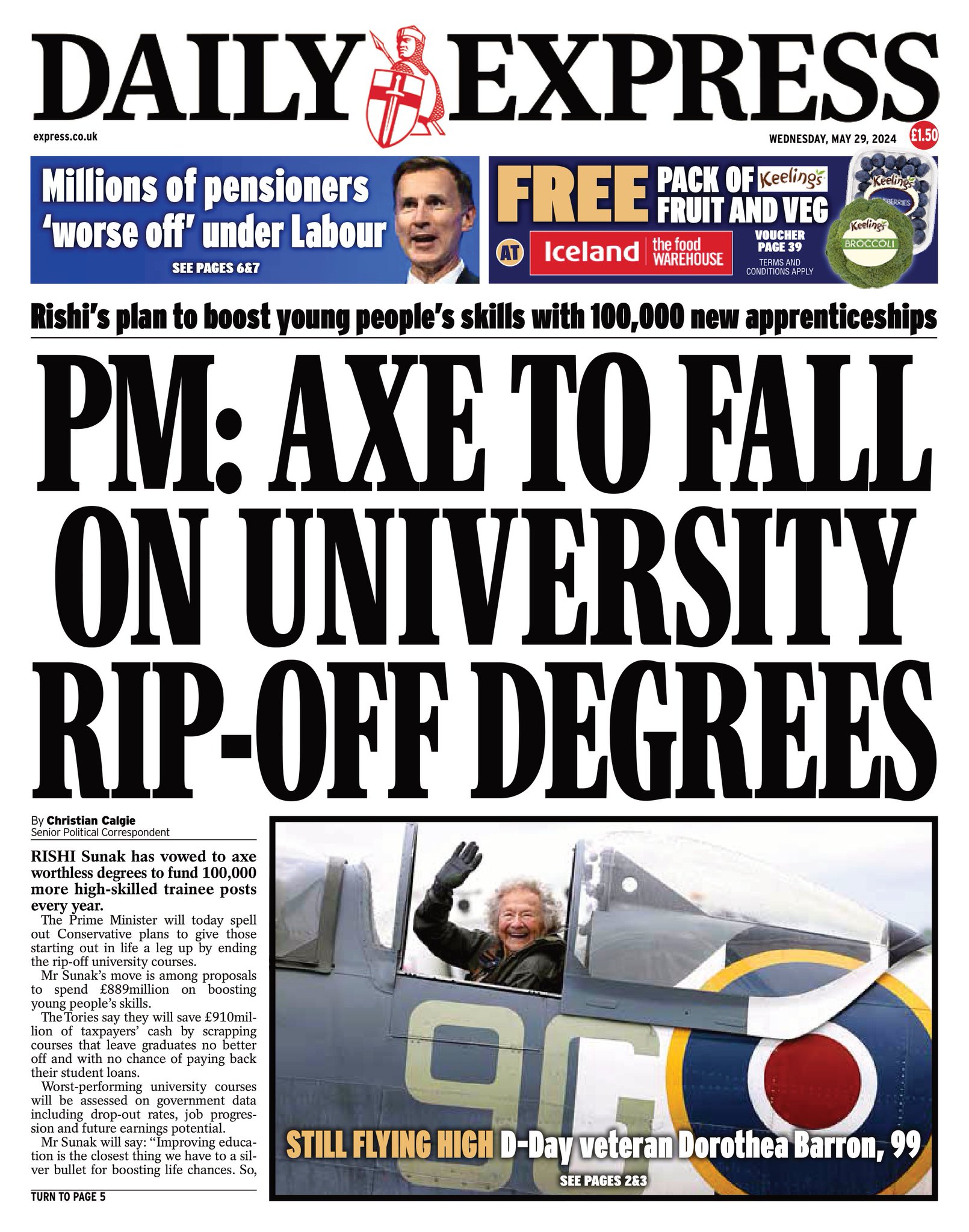 The Daily Express reports on the Prime Minister’s intention to eliminate certain university degrees.