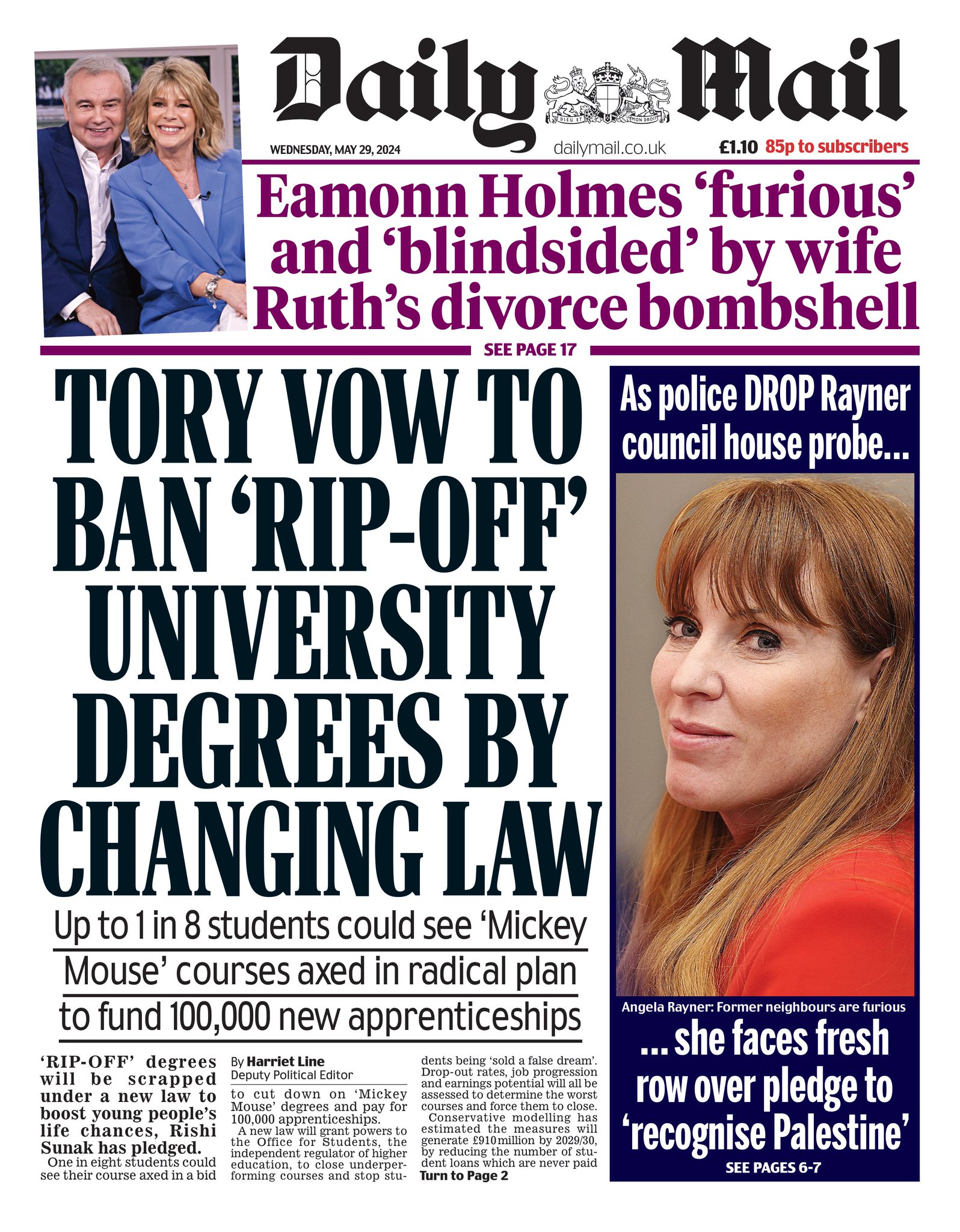 The Daily Mail highlights the Tory’s commitment to eliminating overpriced university degrees.