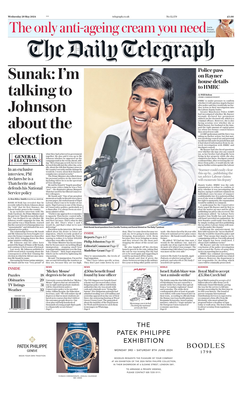 The Daily Telegraph reports on Rishi Sunak’s recent discussion with Boris Johnson about the election.