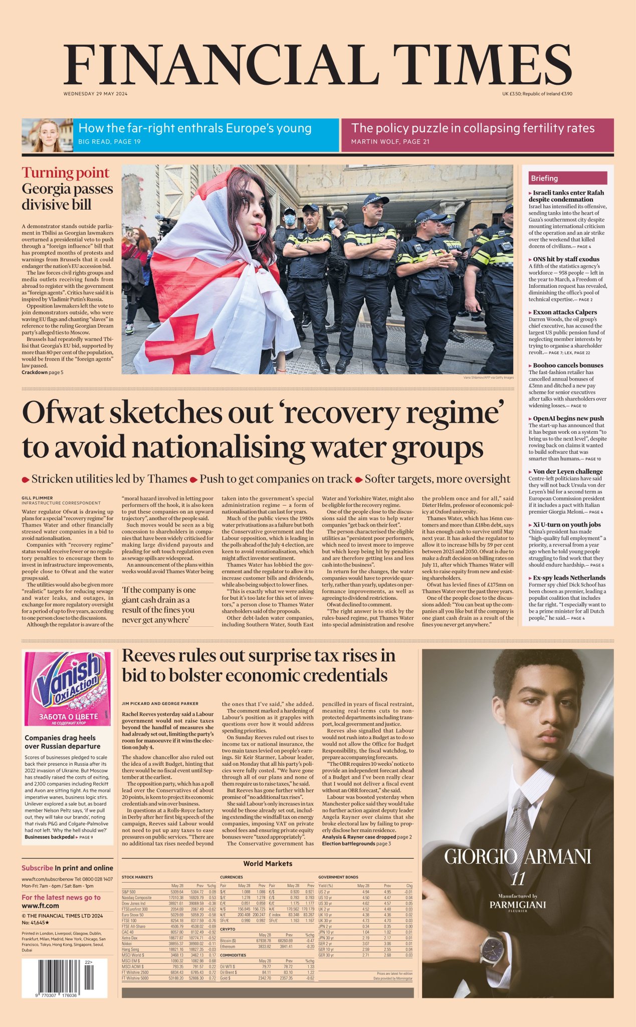 The Financial Times reports on Ofwat’s plans for a recovery regime to save struggling water companies from nationalisation.