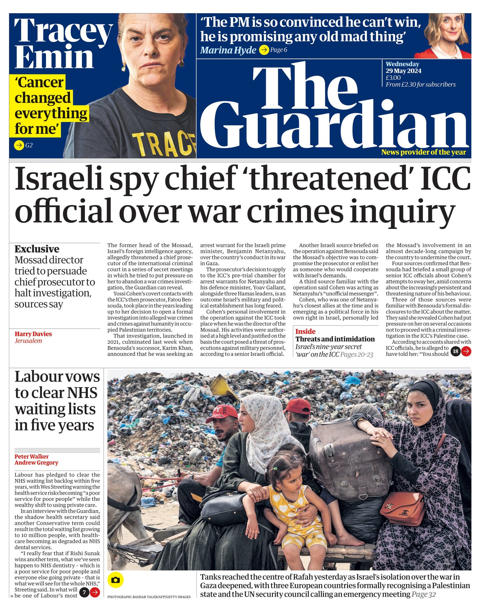 The Guardian reports on allegations of the ex-Israeli intelligence chief pressuring an international criminal court prosecutor to drop a war crimes investigation.