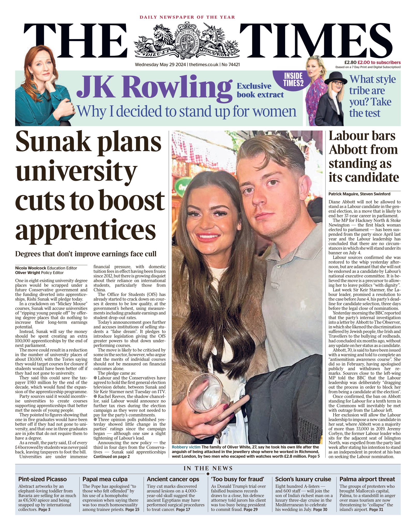 The Times reports on Rishi Sunak’s strategy to reduce university degrees by an eighth and reallocate funds to apprenticeships.
