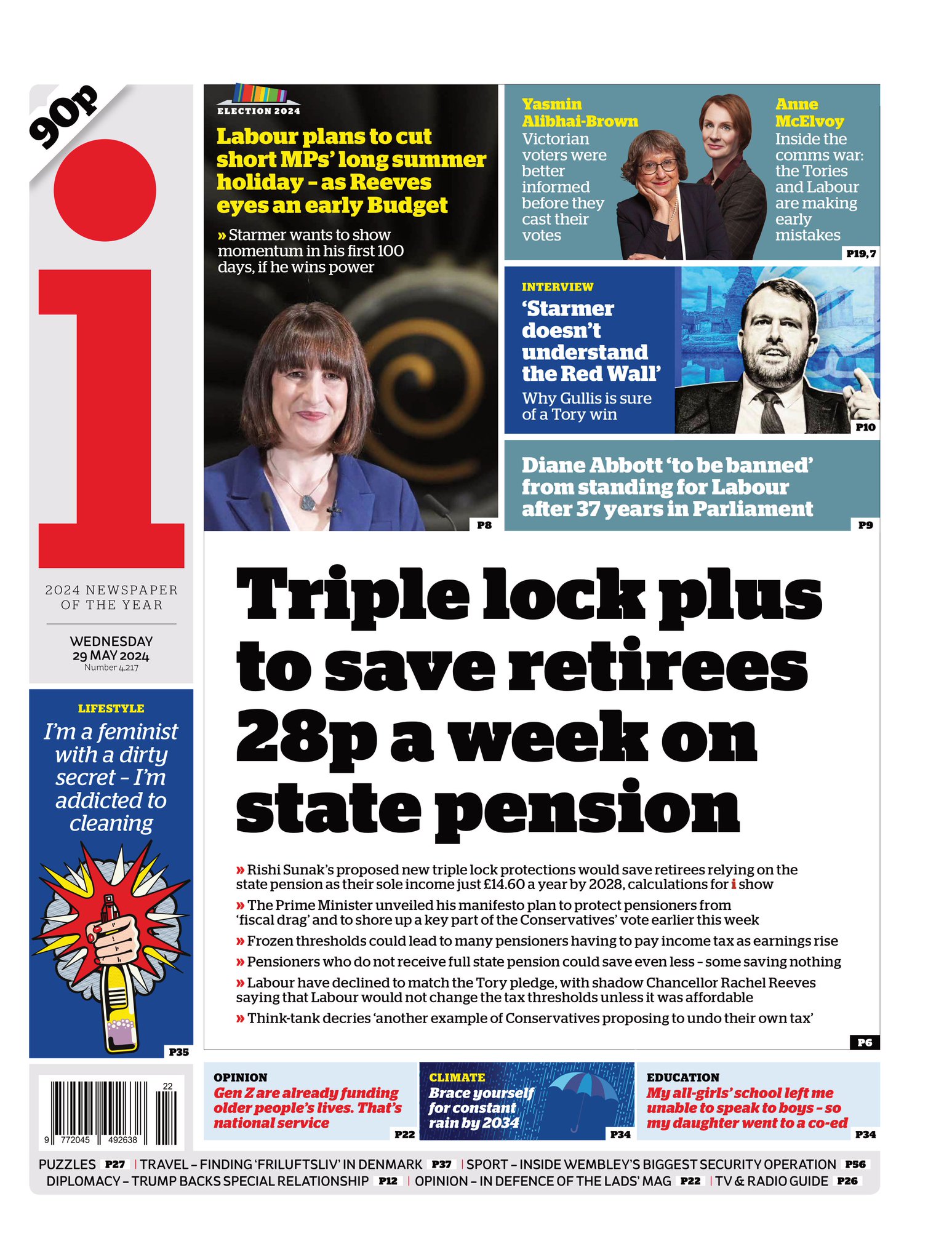 The i newspaper reports Sunak’s triple lock pledge could save pensioners £14.