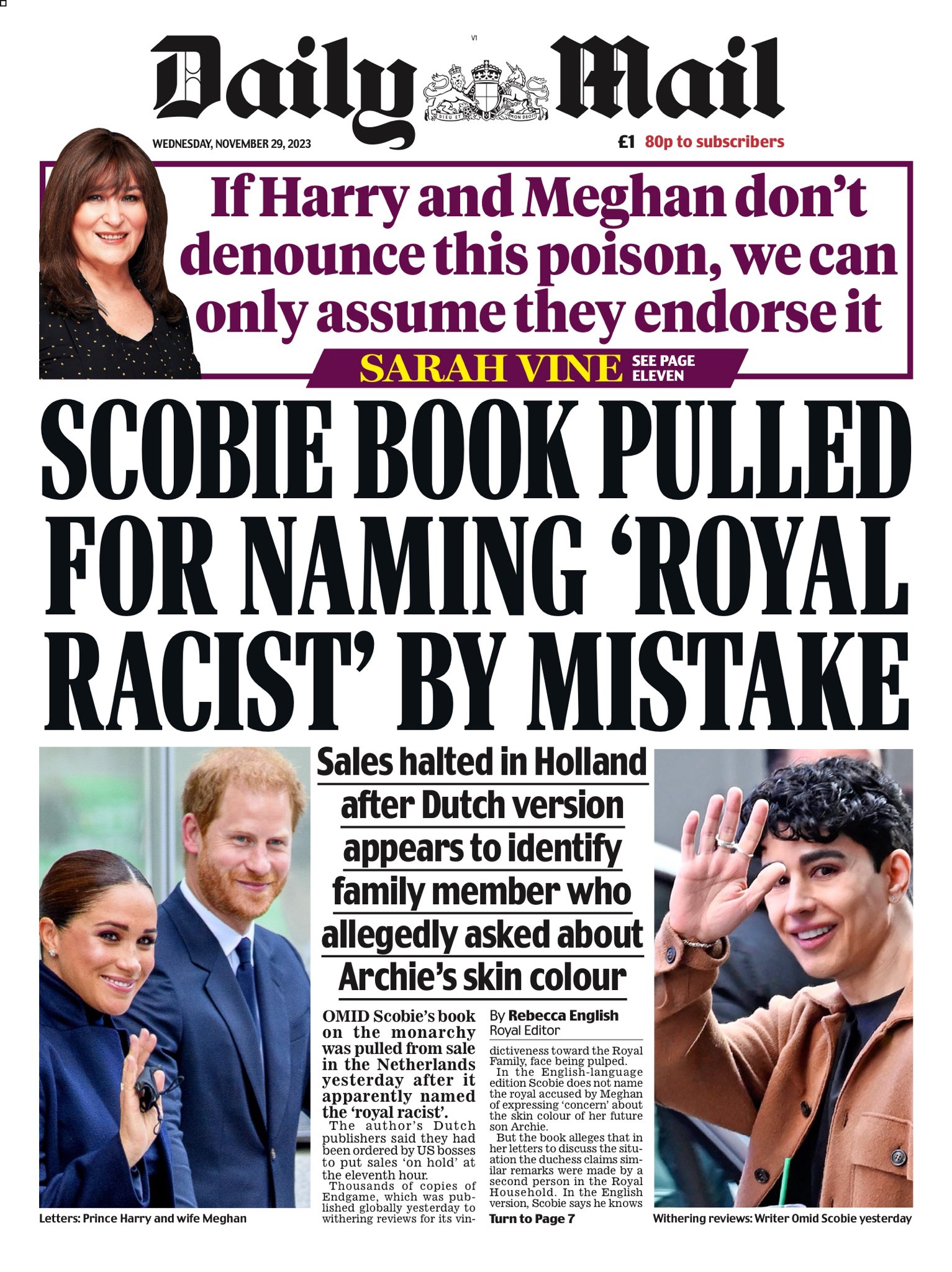 The Daily Mail reports on the withdrawal of Dutch versions of Omid Scobie’s royal book due to alleged naming of a racist family member.