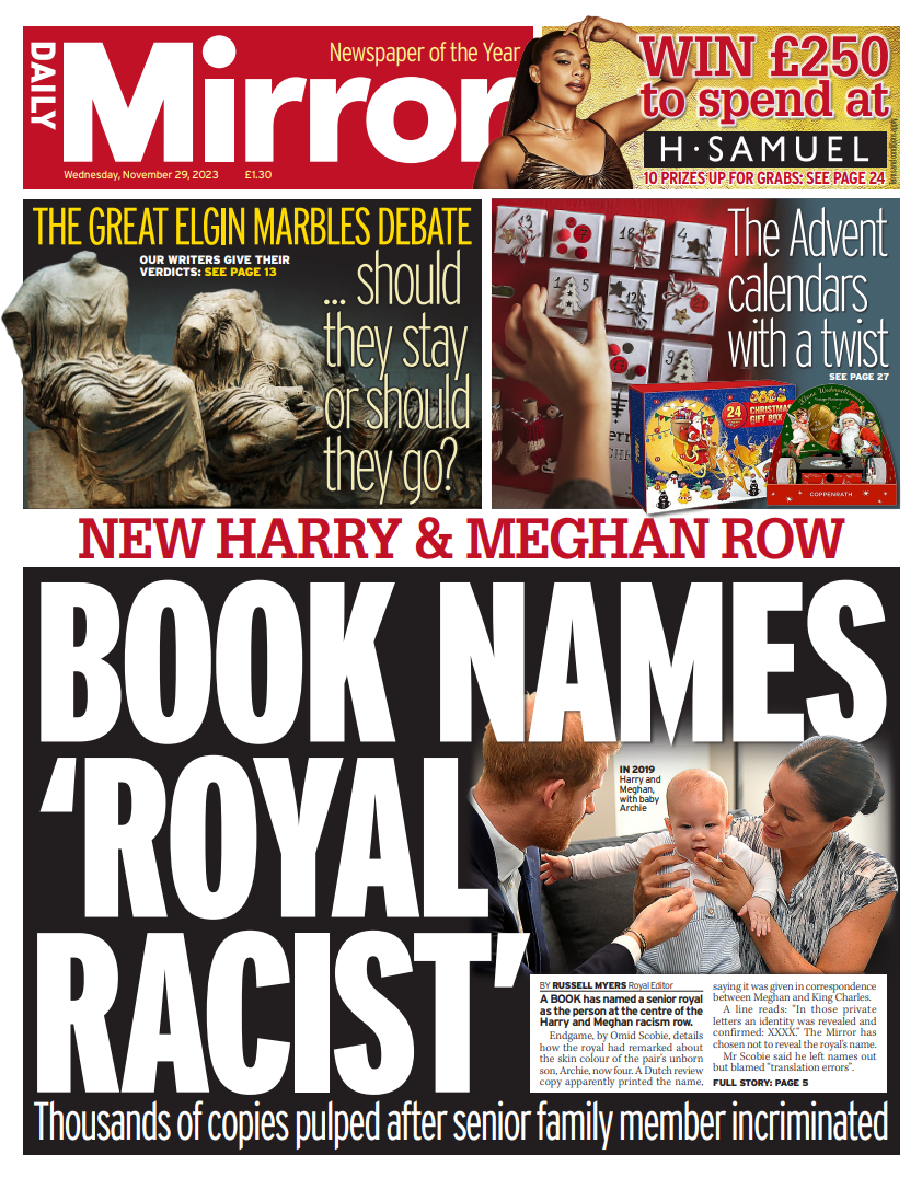 The Daily Mirror leads with the revelation that a senior royal is named in the Dutch version of Omid Scobie’s book, Endgame, as the source of a racism claim by the Duchess of Sussex.